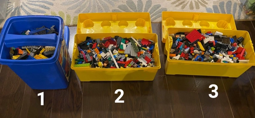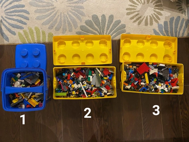 LEGO bricks, mostly standard pieces, in three storage containers. There are a variety of colours and sizes. Would be great for building or for a collector. Includes Lego container. No figures are included. Sold separately.