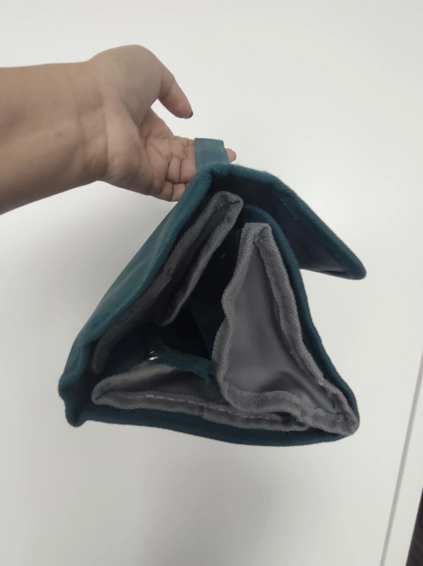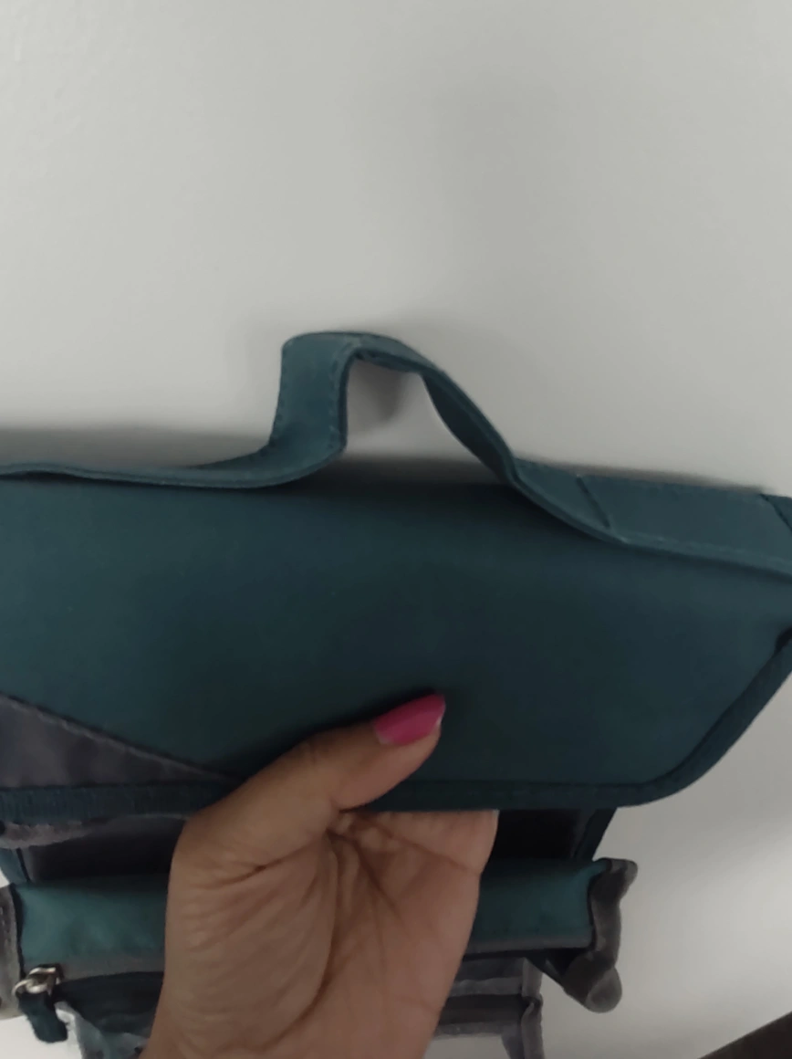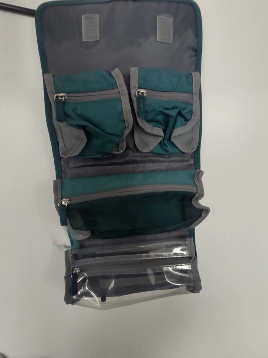 Teal and grey toiletry bag with multiple compartments. It has a zipper closure and a carrying handle.
