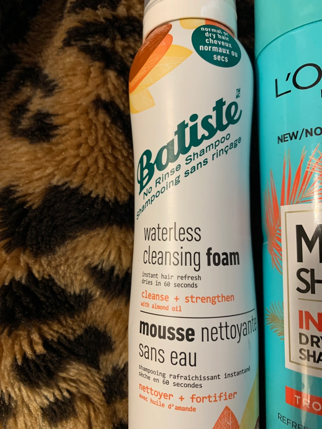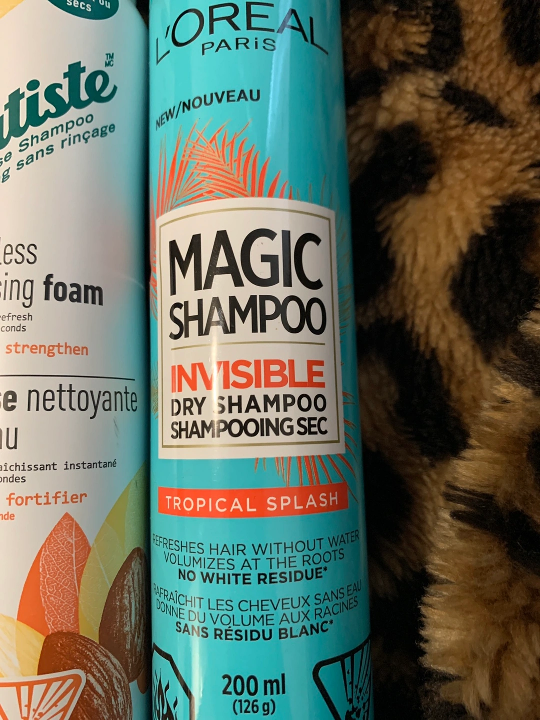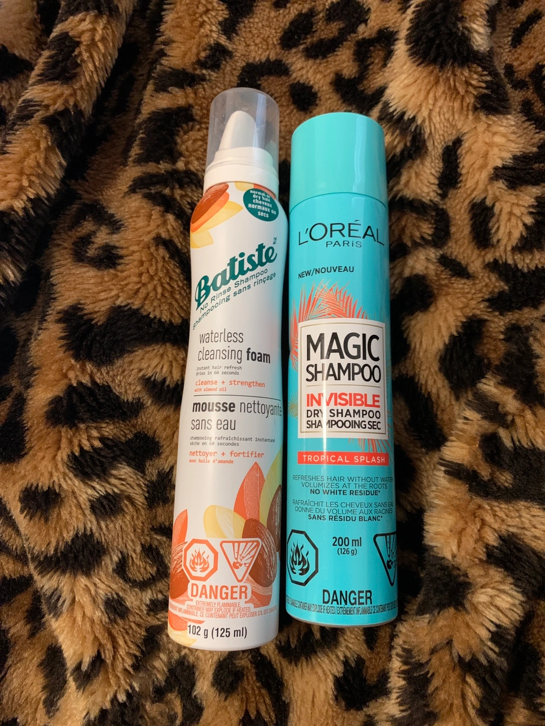 Two full-size dry shampoos, one Batiste and one L'Oreal. The Batiste is the Waterless Cleansing Foam with Almond Oil and the L'Oreal is Magic Invisible Dry Shampoo in Tropical Splash.