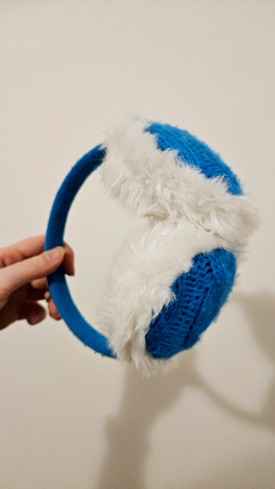 These ear warmers are blue knit with a white fuzzy trim. They are great for keeping your ears warm in the winter!