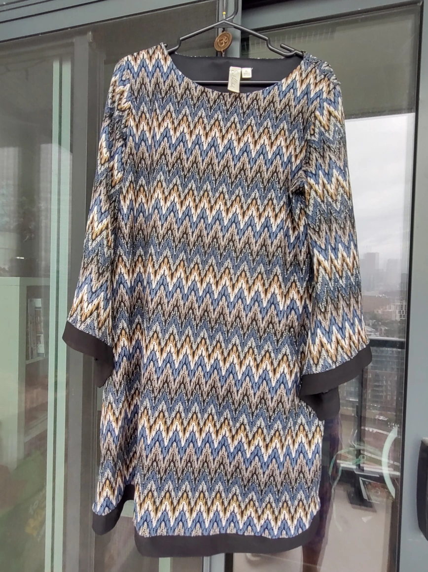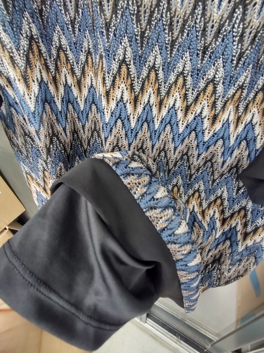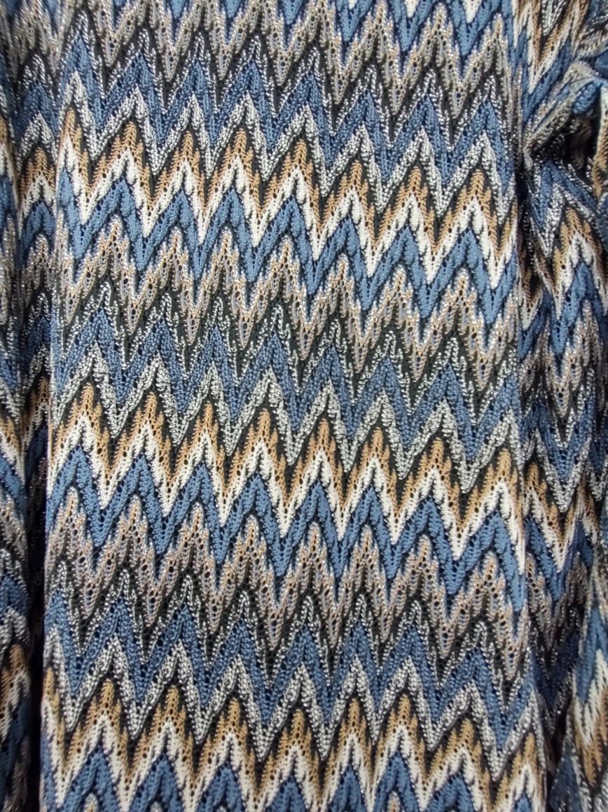 A long-sleeved top in a blue, tan, and black zigzag pattern.