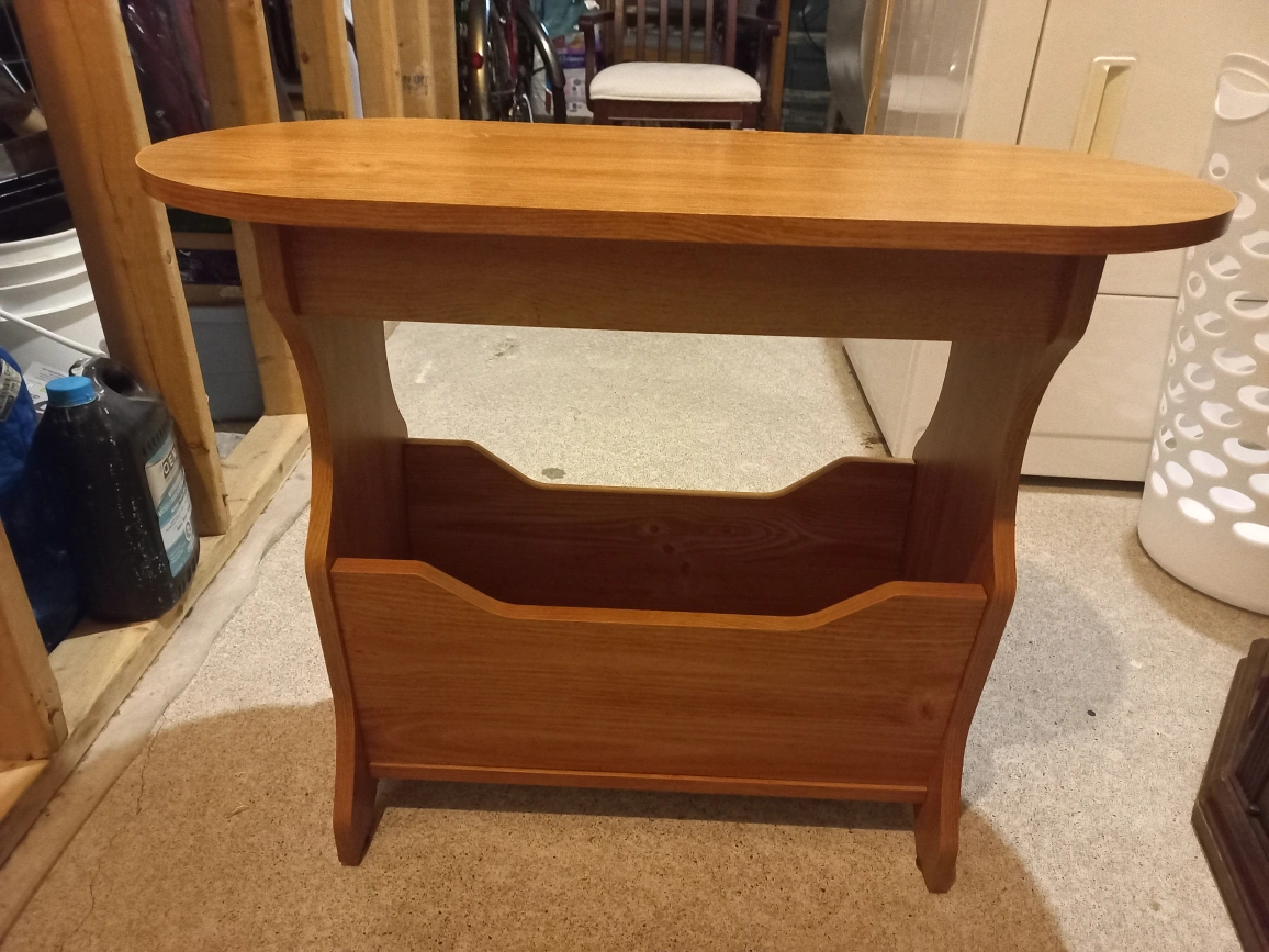 This is a small wooden end table with a magazine rack. It is made of solid wood and has a nice finish. It is perfect for a small space or beside a chair.