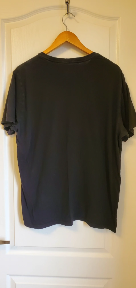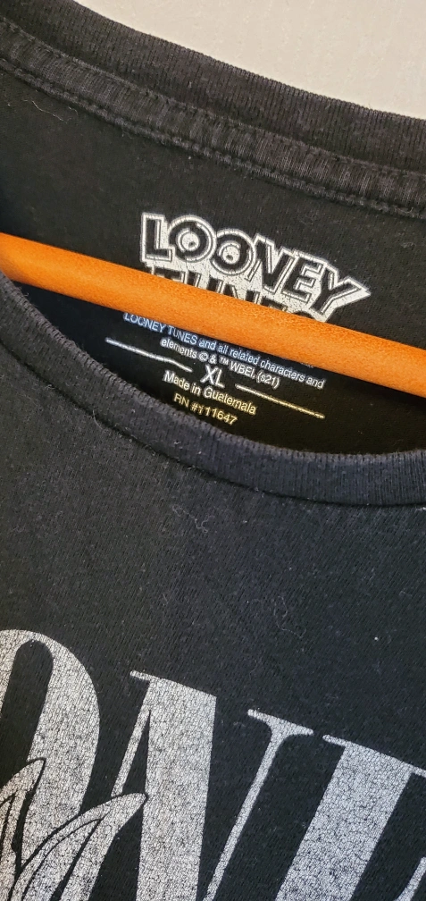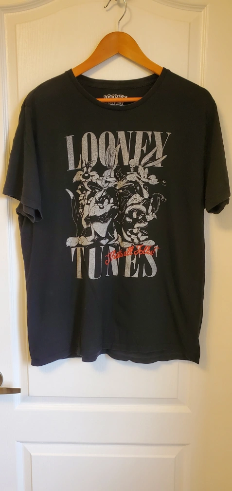 Black short sleeve t-shirt with a white Looney Tunes graphic on the front. The graphic features Bugs Bunny, Daffy Duck, Sylvester, Tweety, and Porky Pig. The back of the shirt is plain black.