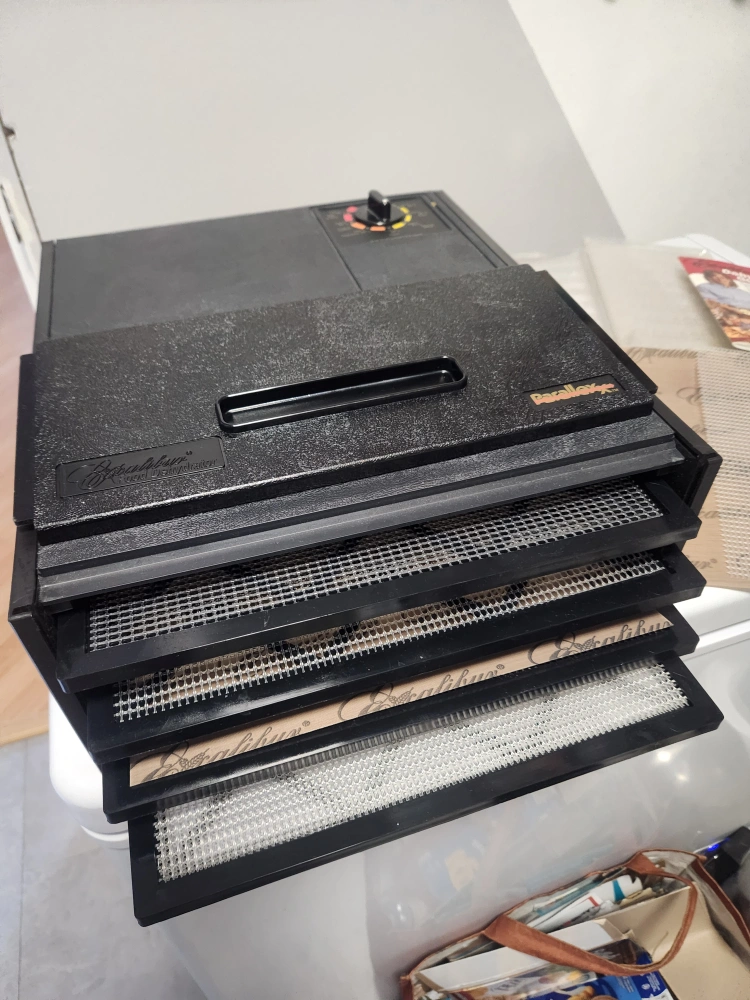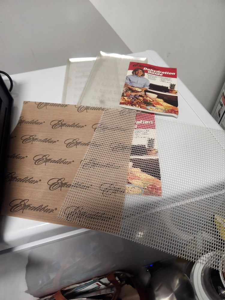 Excalibur Electric Food Dehydrator with 4 trays Never used much. Includes 10 mesh drying sheets , 4 Non Stick drying mats. I have also included8trays from my previous dehydrator that are good for fruit or vegetable rollups. Comes with dehydration guide. In great condition.