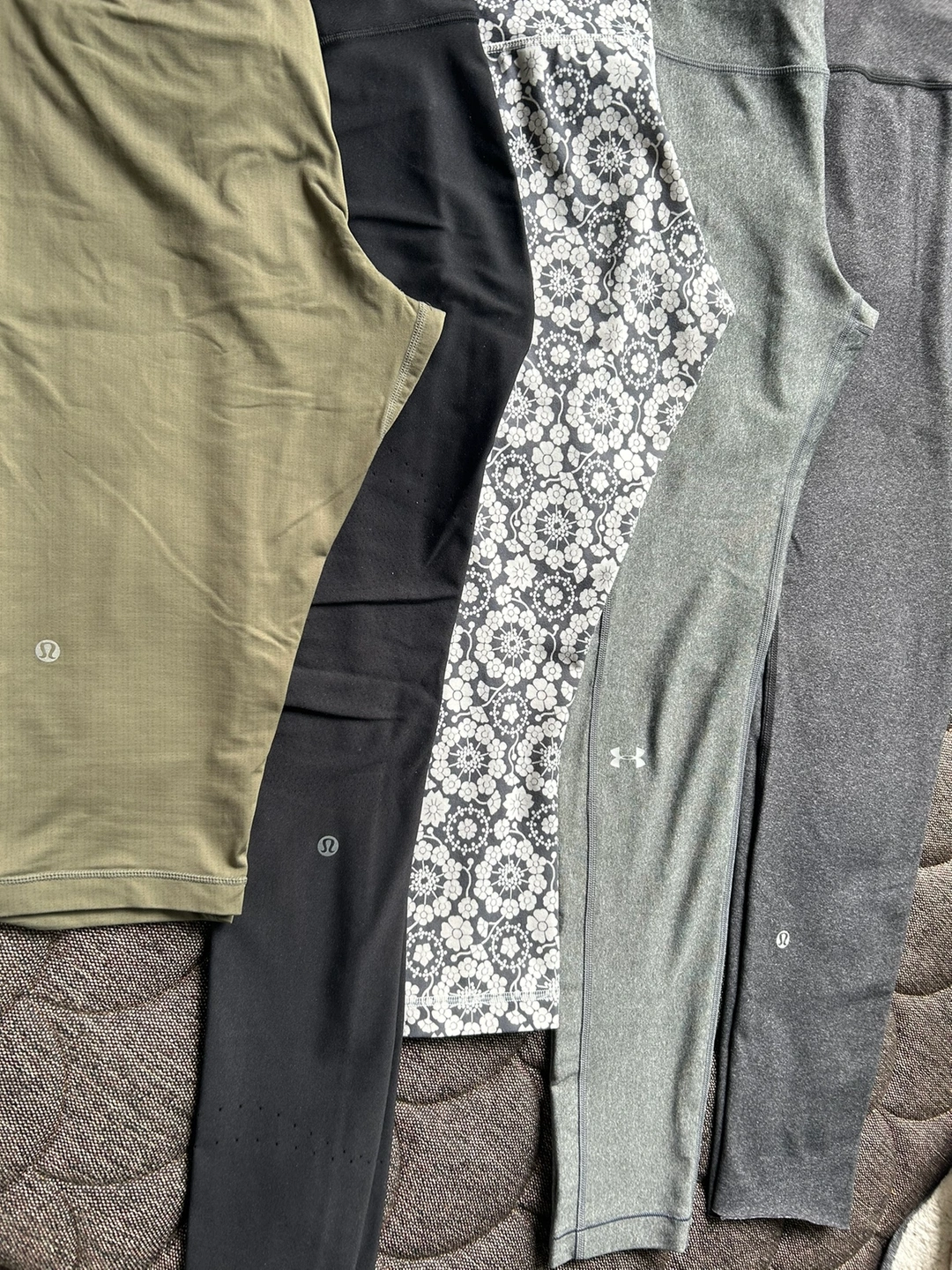 Beautiful bundles of four Lululemon leggings. - Black Lululemon is x small 65$ wear twice, like brand new - Green Lululemon is medium 30$ - dark gray Lululemon medium 40$ - light gray “under armour 45$ -black medium “Gap” 10$