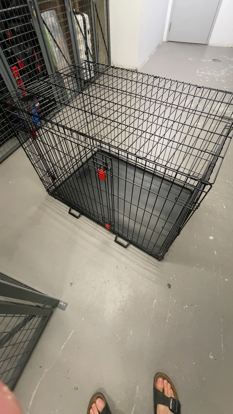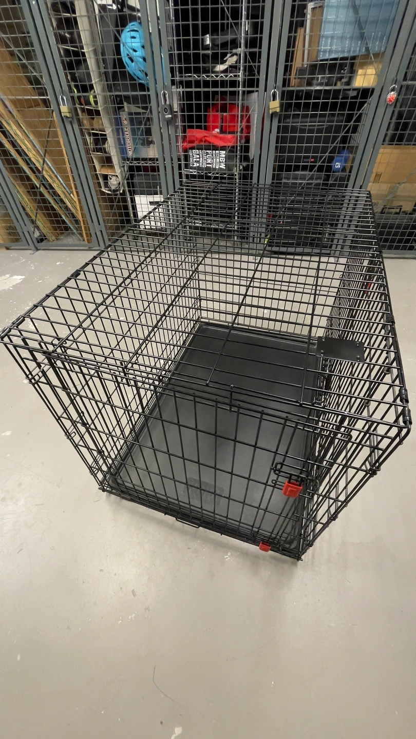 Used for our golden retriever for about a year, the crate is in perfect condition. The dimensions are 42”Lx29”Wx31”H and there is an adjustable (removable) divider to allow you to adjust the space you need from puppy to adult size. There is a plastic tray at the bottom coming with it but no bed.