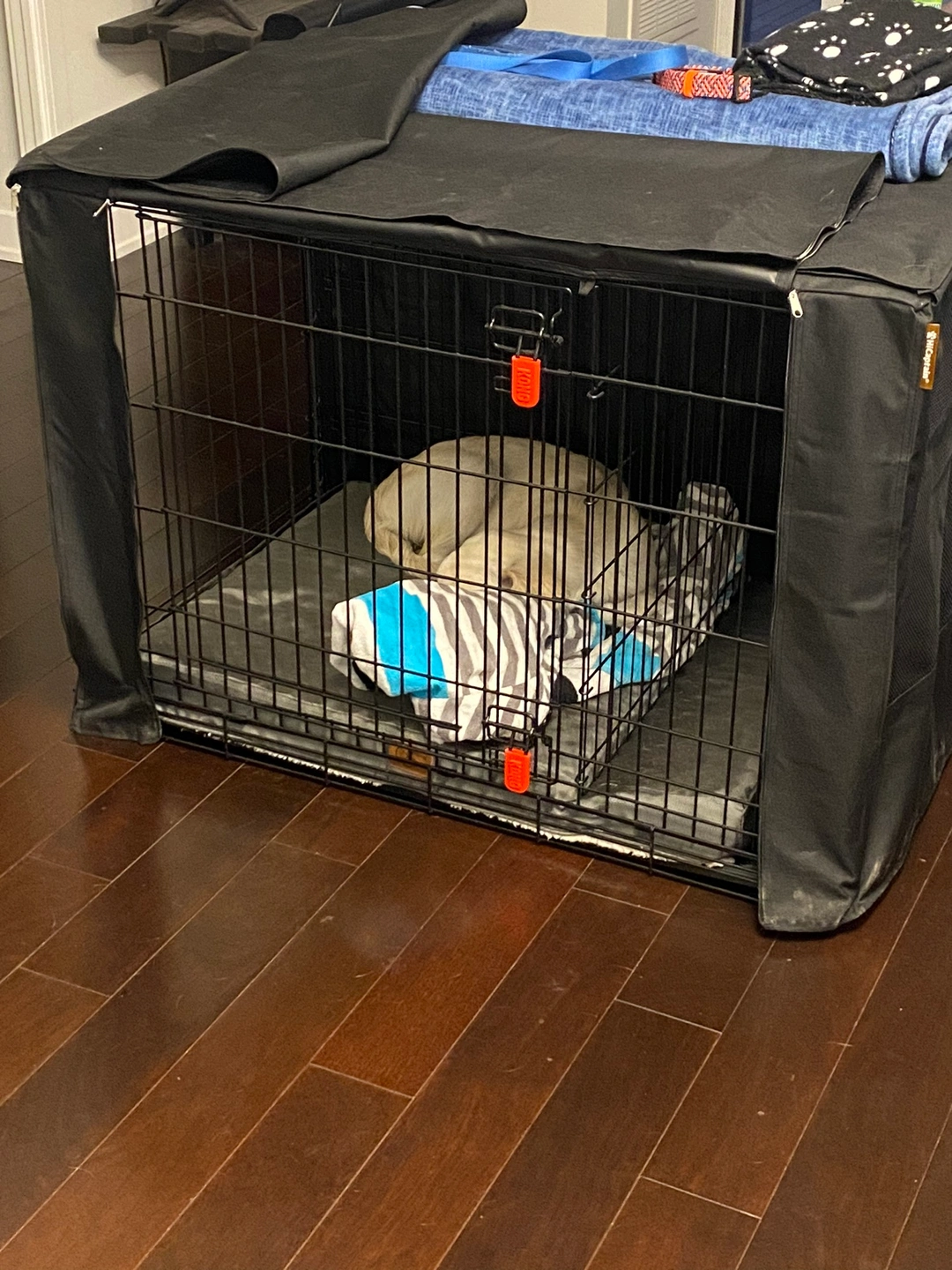We also have a black cover matching the dimension of the crate so it’s darker inside if your pup is happier with a darker space. The cover has two flaps matching the position of the two doors on the crate and a flaps for a ventilation at the back.