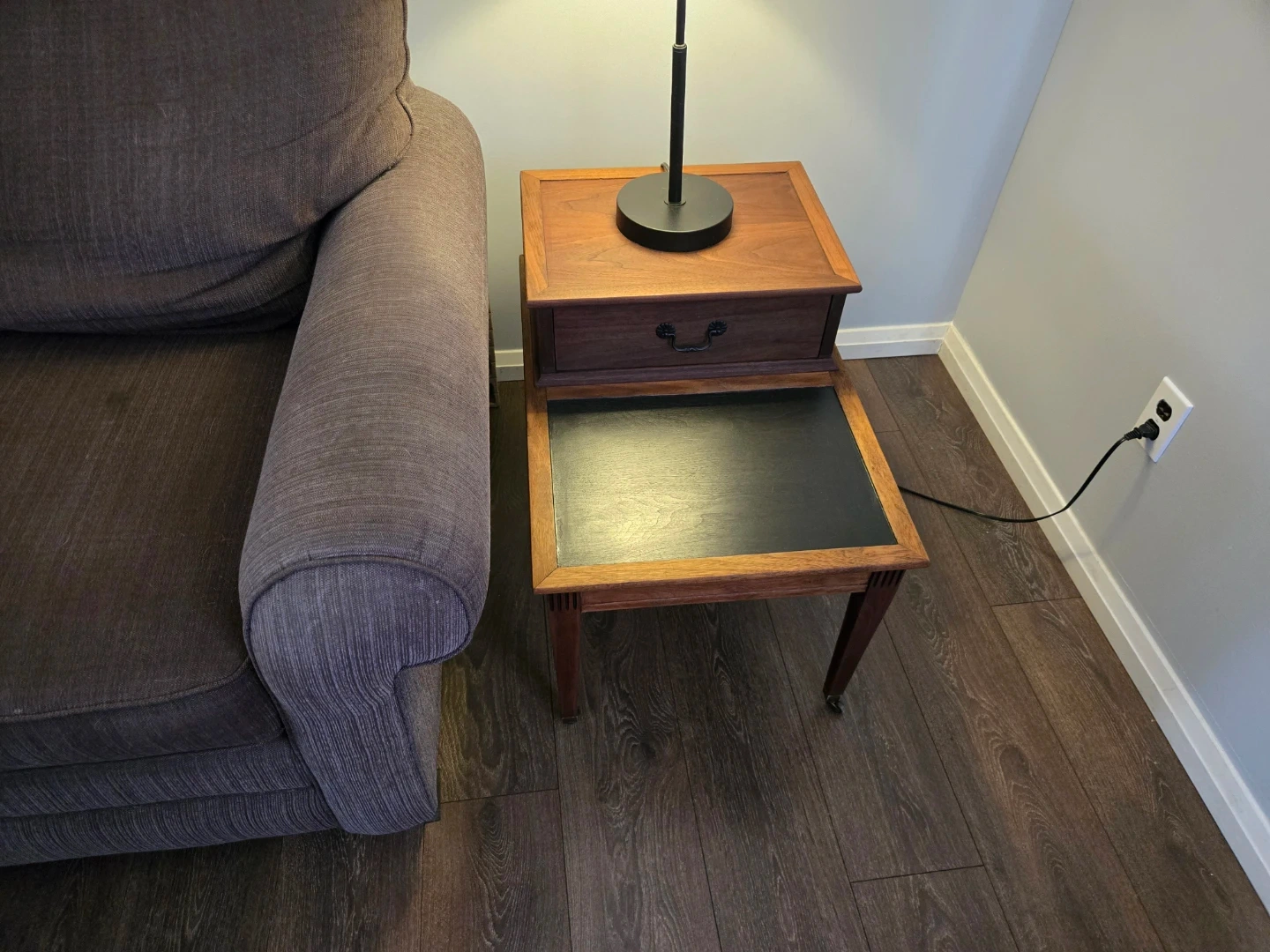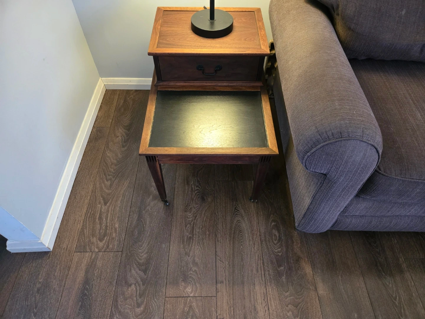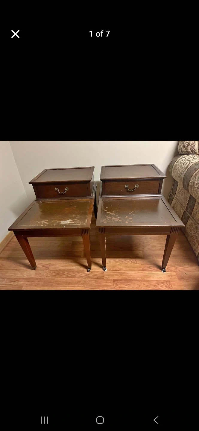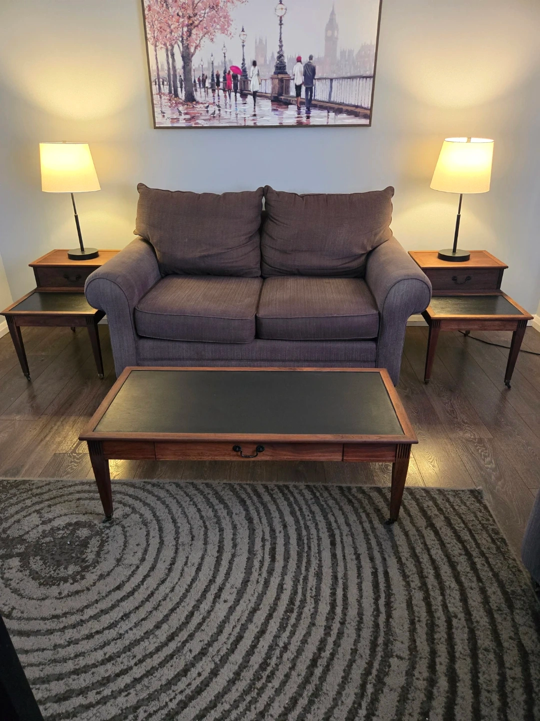 Lovely wooden coffee table featuring a dark inset top and a single drawer. It has a classic design that's been popular for years. The table's wood finish is a warm tone. Fully refurbished with castor wheels.