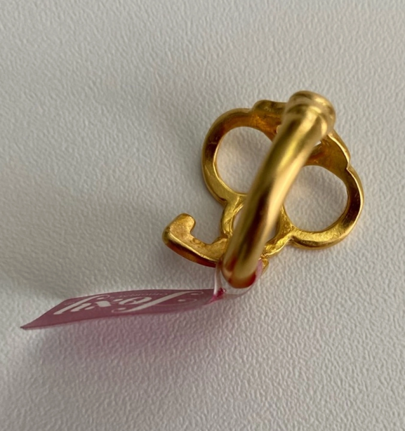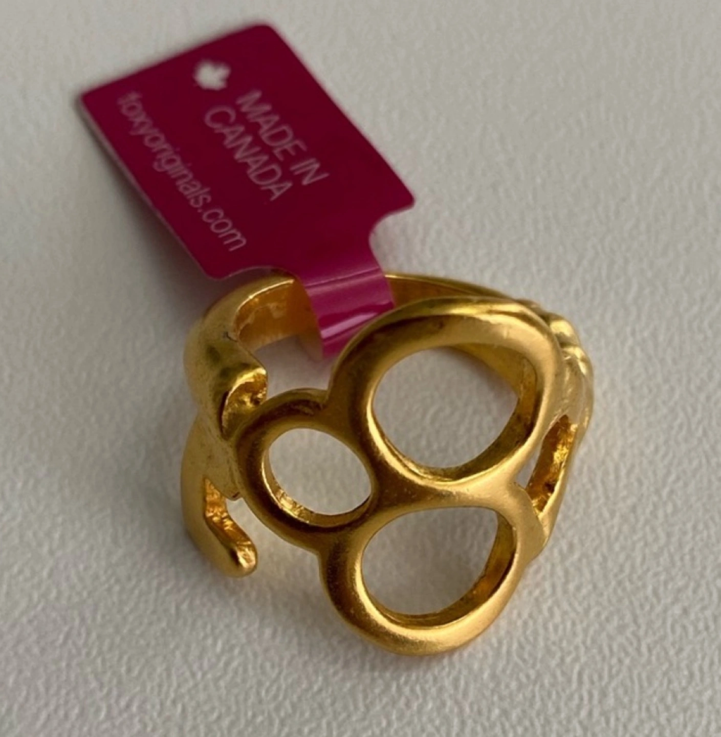 A gold tone ring with a unique design. Made in Canada with tag attached.
