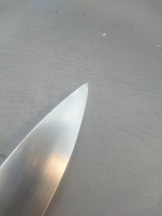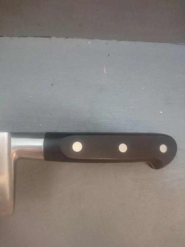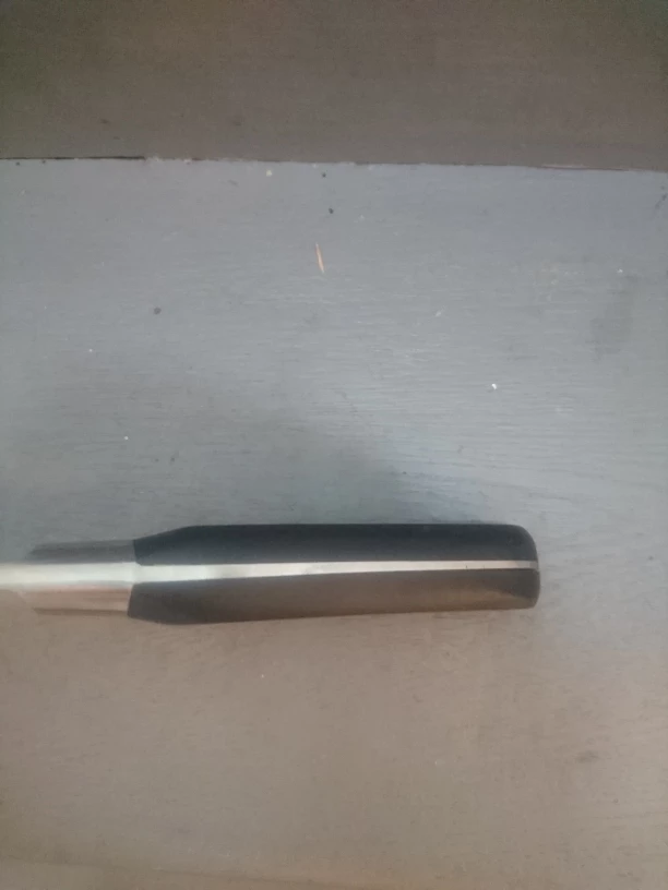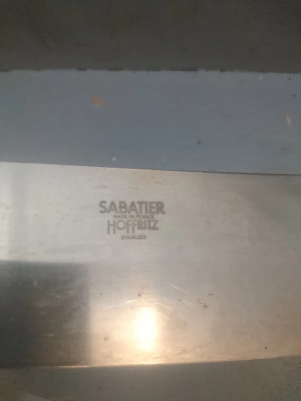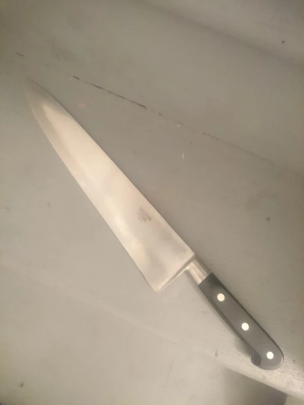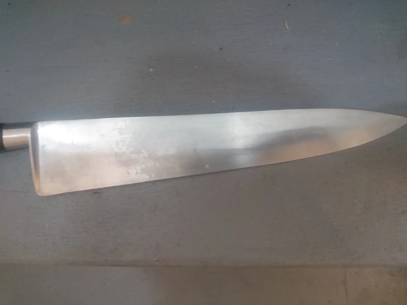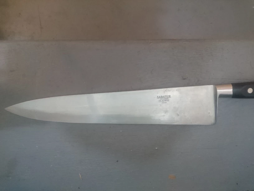 Large chef's knife with a black handle. Made in France. The blade is approximately 12 inches long. This knife is in good condition. The blade is not chipped or broken. The handle is intact. Pick up College and Clinton or Ossington area