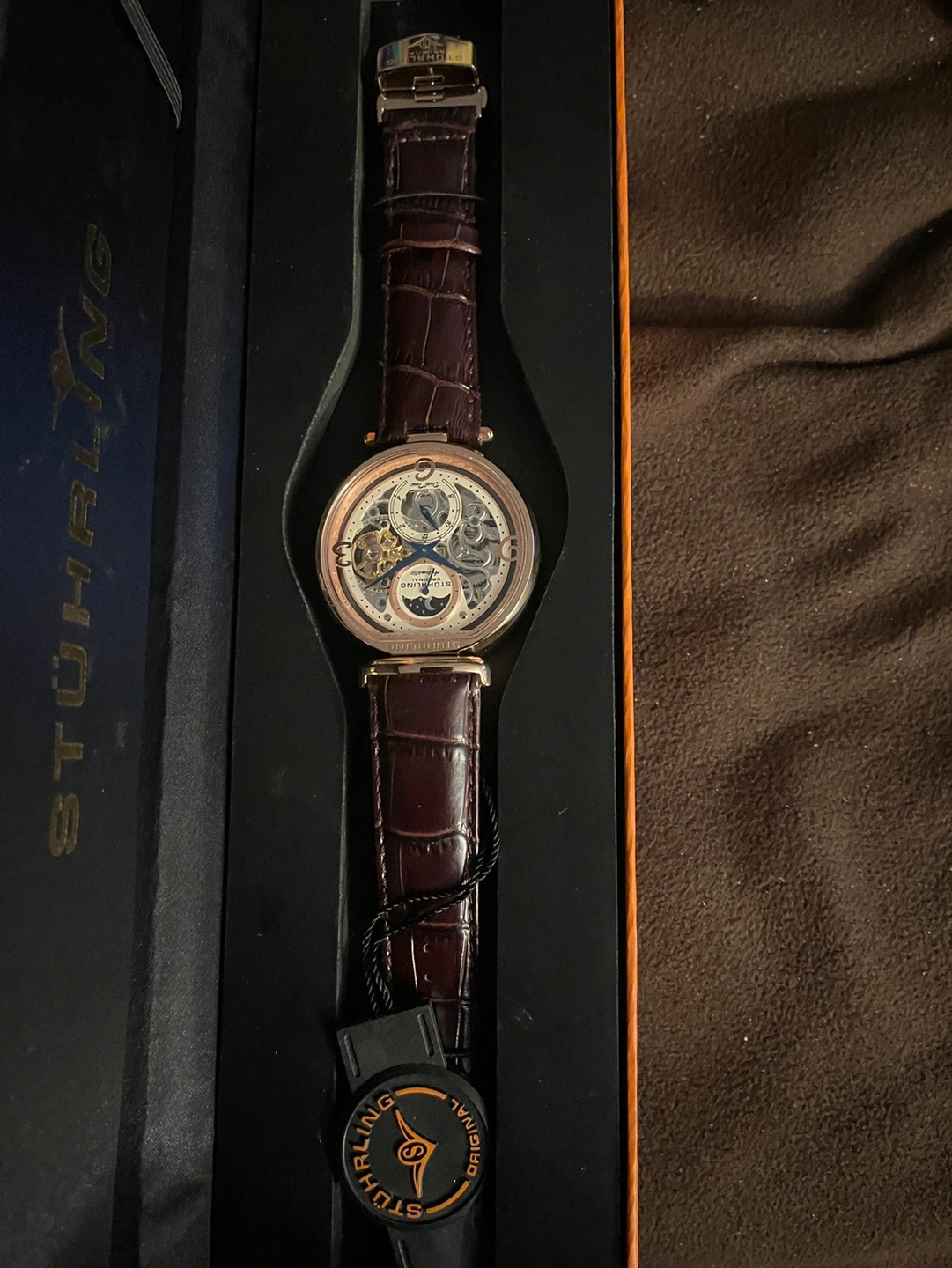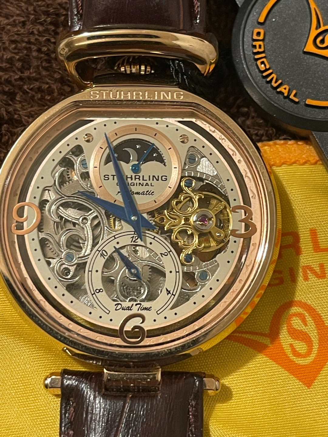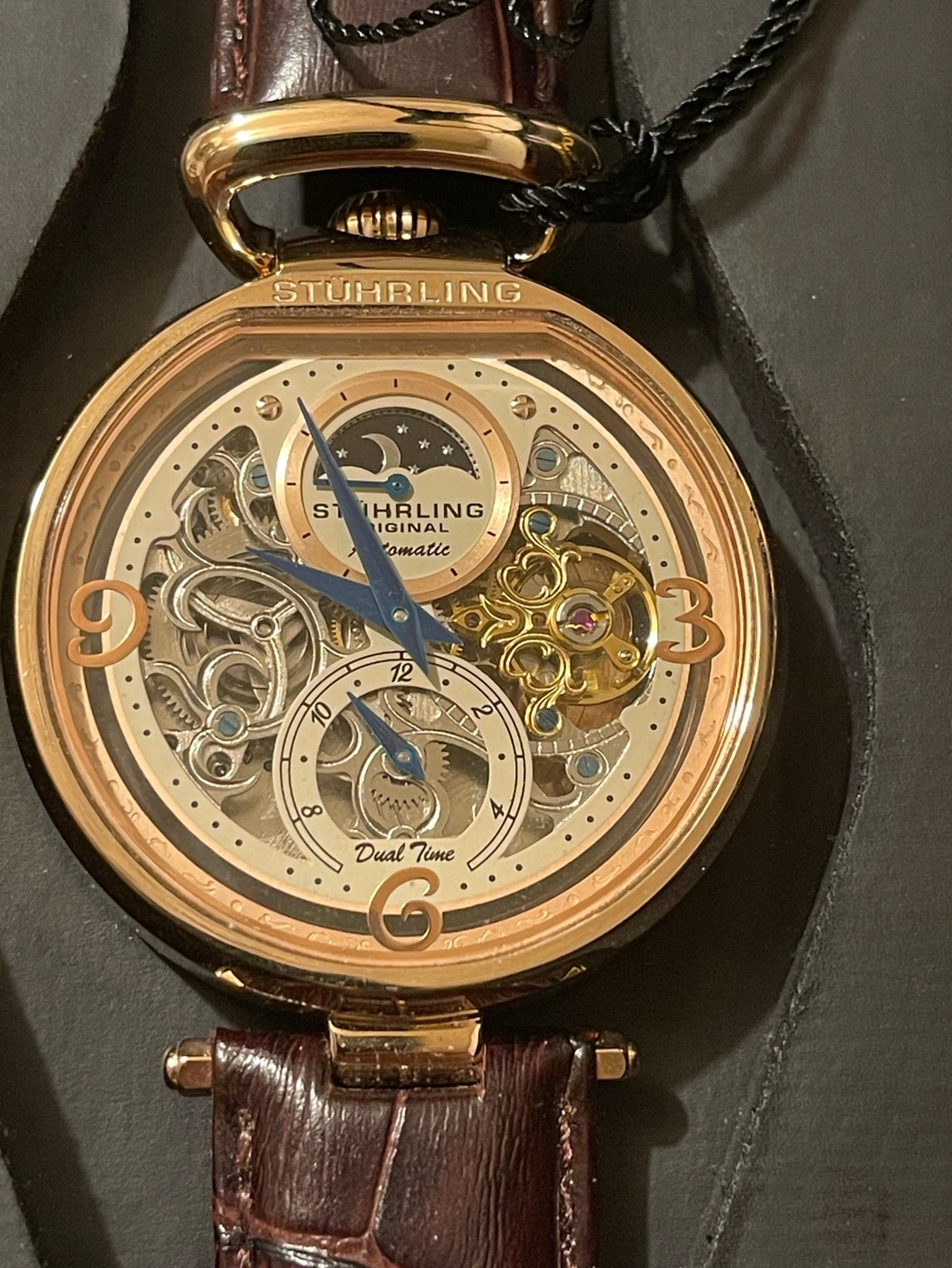Men's watch with a brown leather band. The watch is a skeleton automatic with a rose gold face and a dual time feature. The face is round. The watch includes a box. Model 889.03.