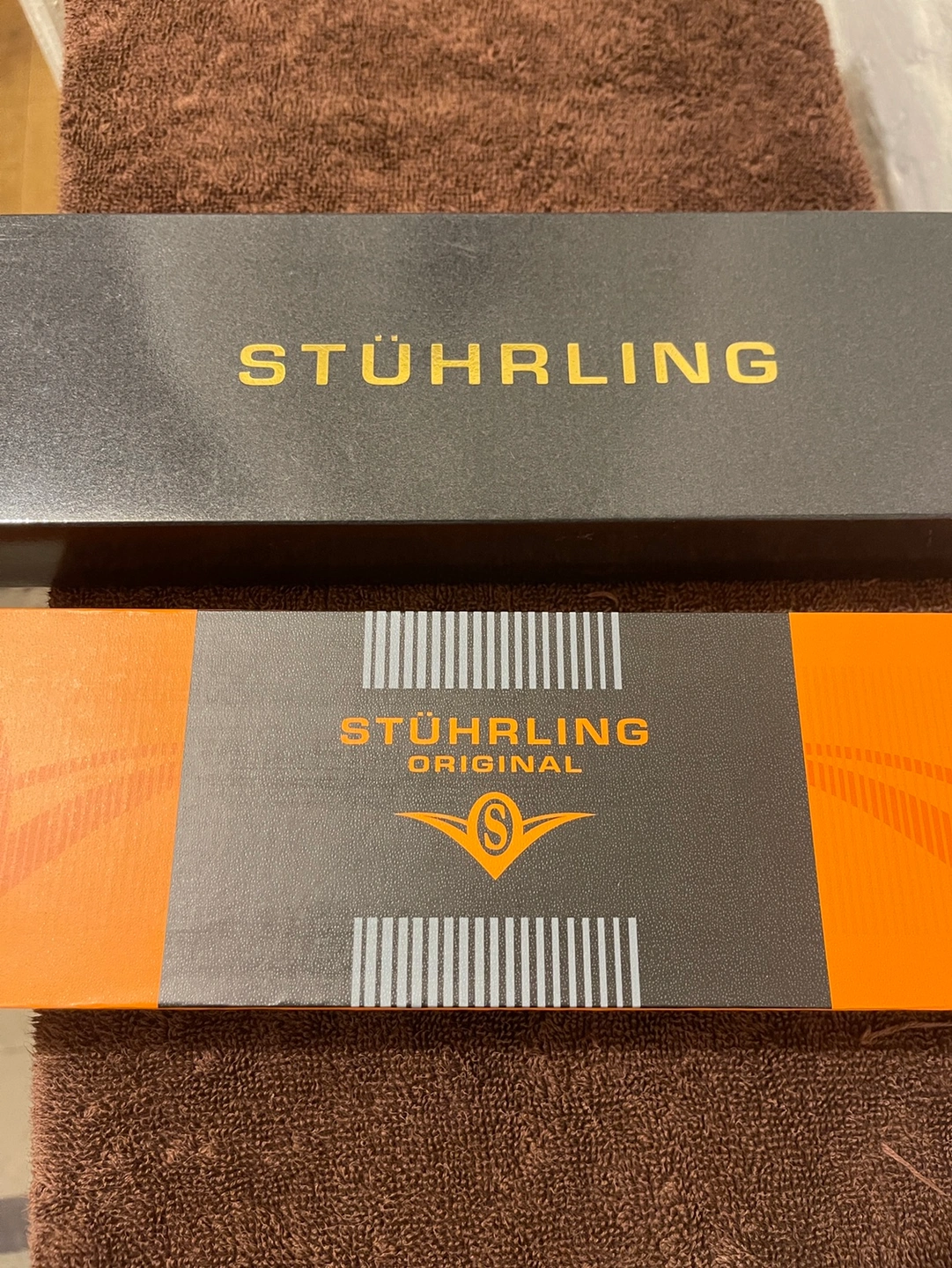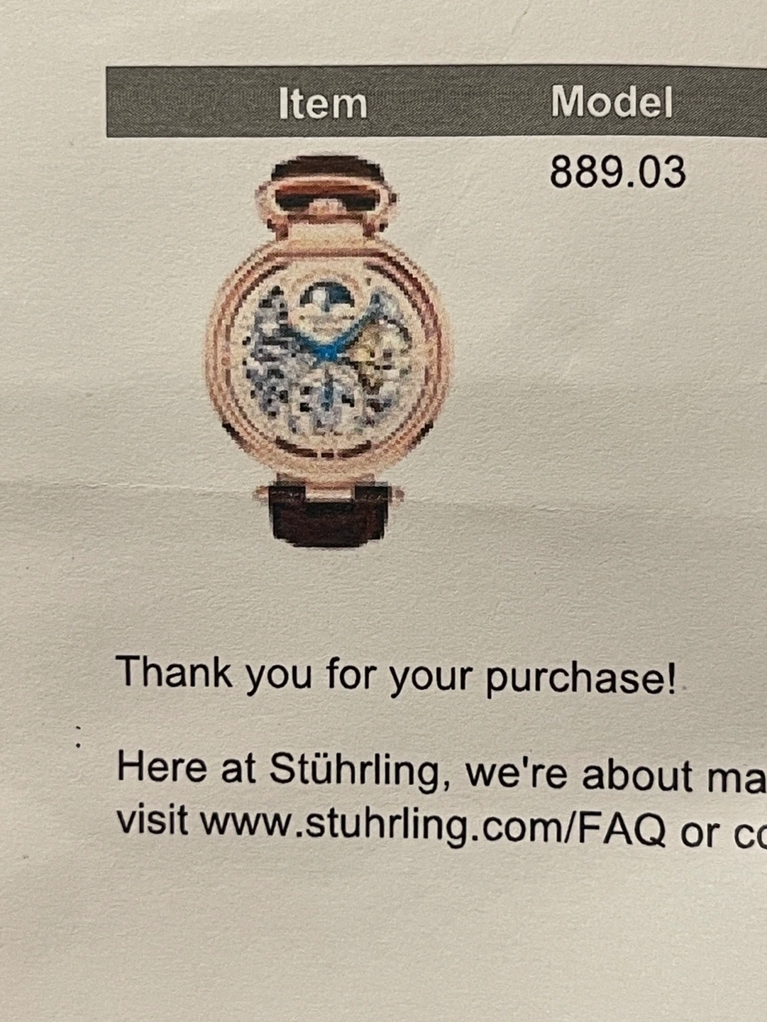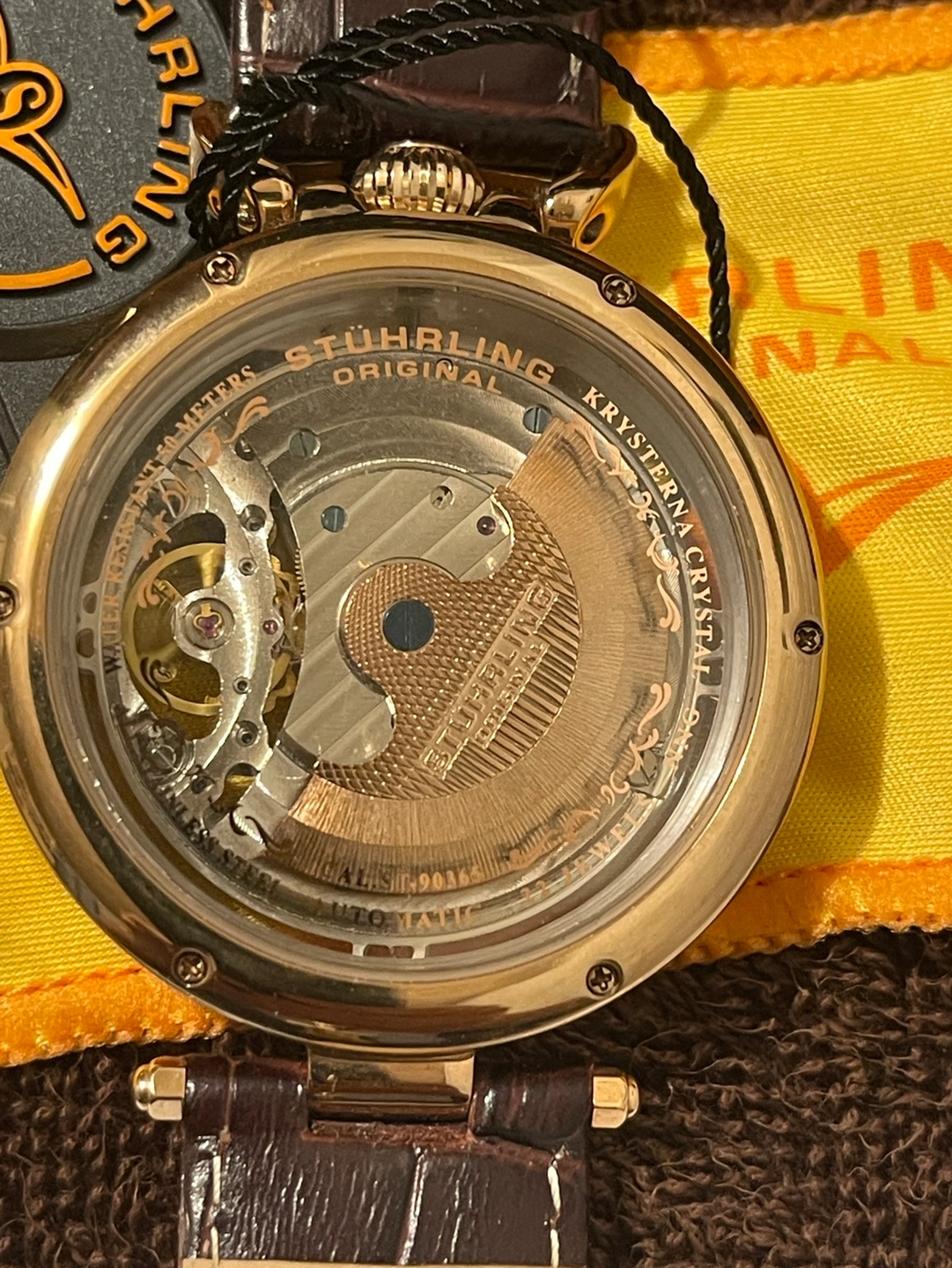 Men's watch with a brown leather band. The watch is a skeleton automatic with a rose gold face and a dual time feature. The face is round. The watch includes a box. Model 889.03.