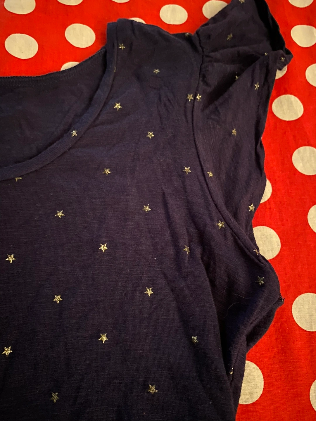 Size S, from aerie. Unworn, just rumpled from being in storage. Snap crotch, super stretchy and soft. Navy blue with a slight heathered look to the fabric, and tiny silver metallic stars. Sweet and adorable ruffle flutter sleeves.