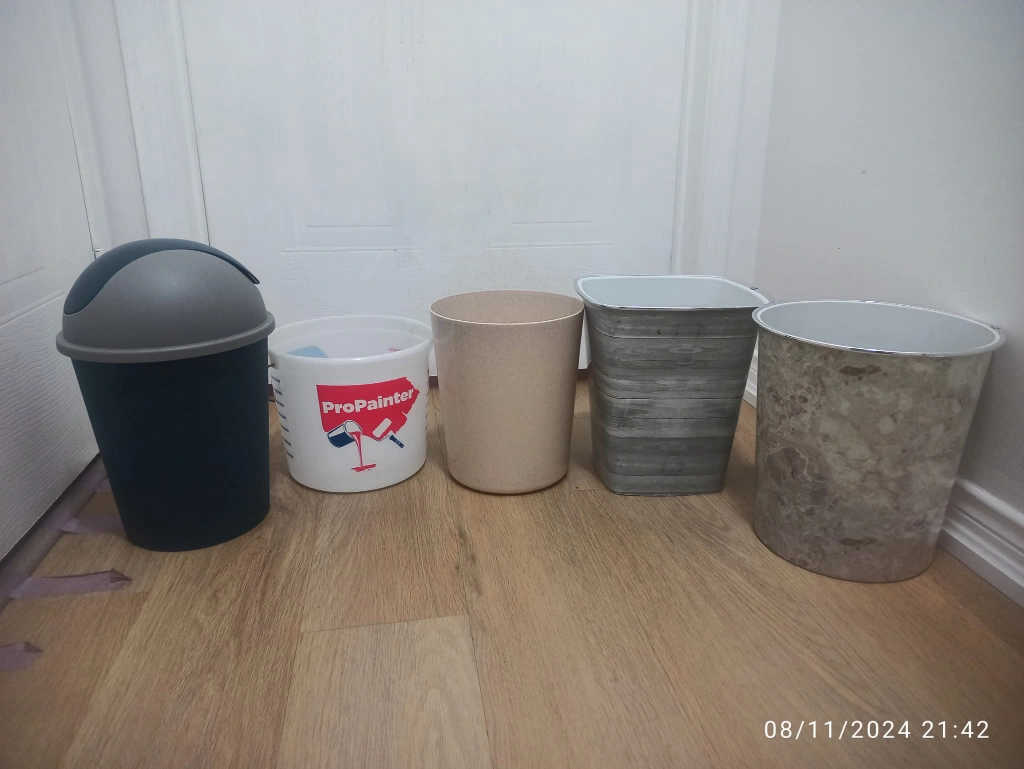 Set of 4 Trash Cans + 1 small paint bucket(unused)
