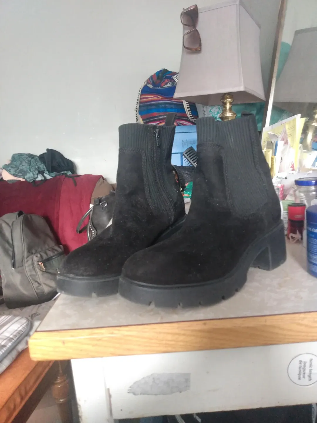 Black suede ankle boots with a side zipper closure and a chunky heel. These boots feature a ribbed sock-like top for a comfortable fit. They're great for adding a stylish touch to any outfit!