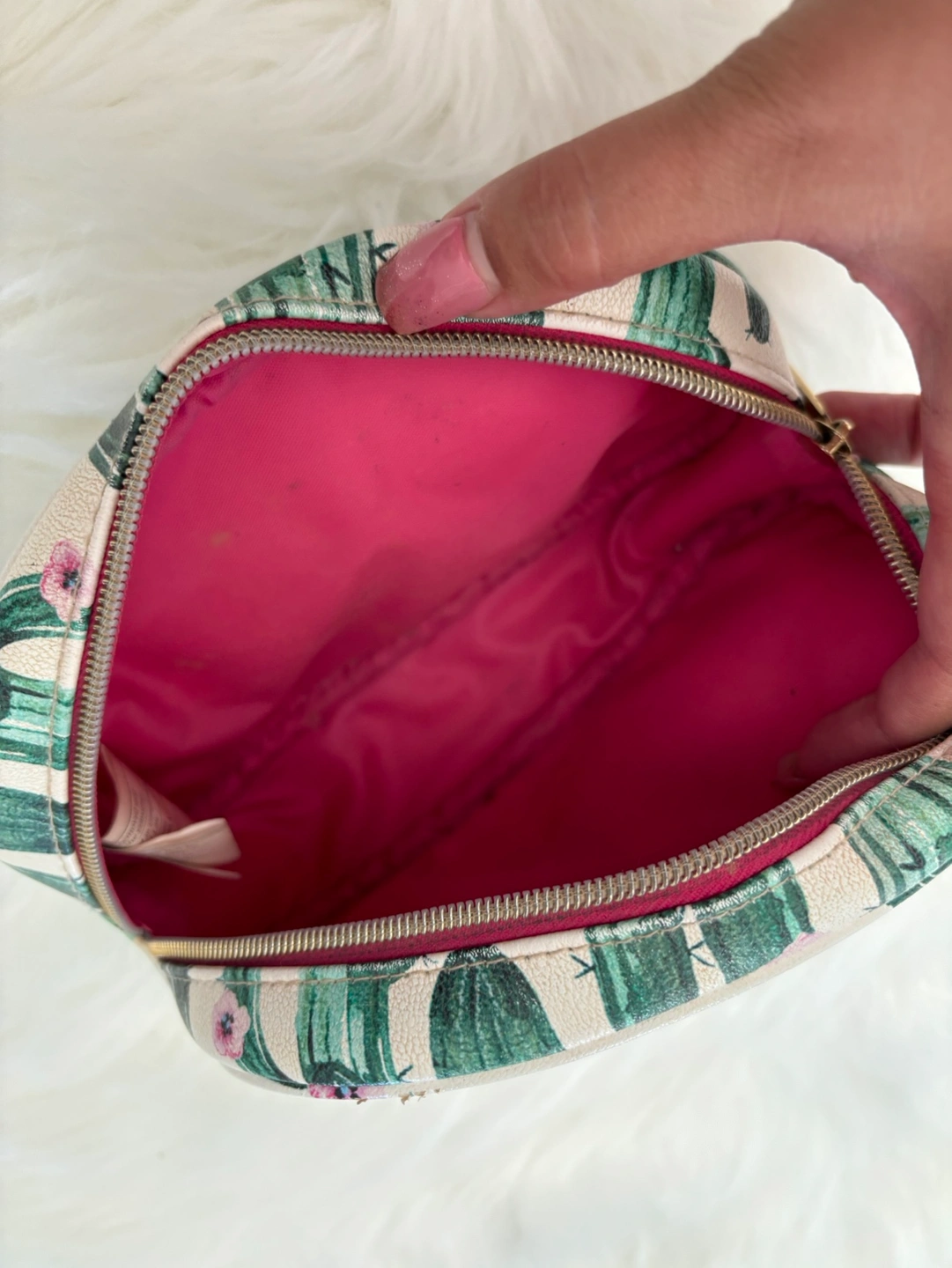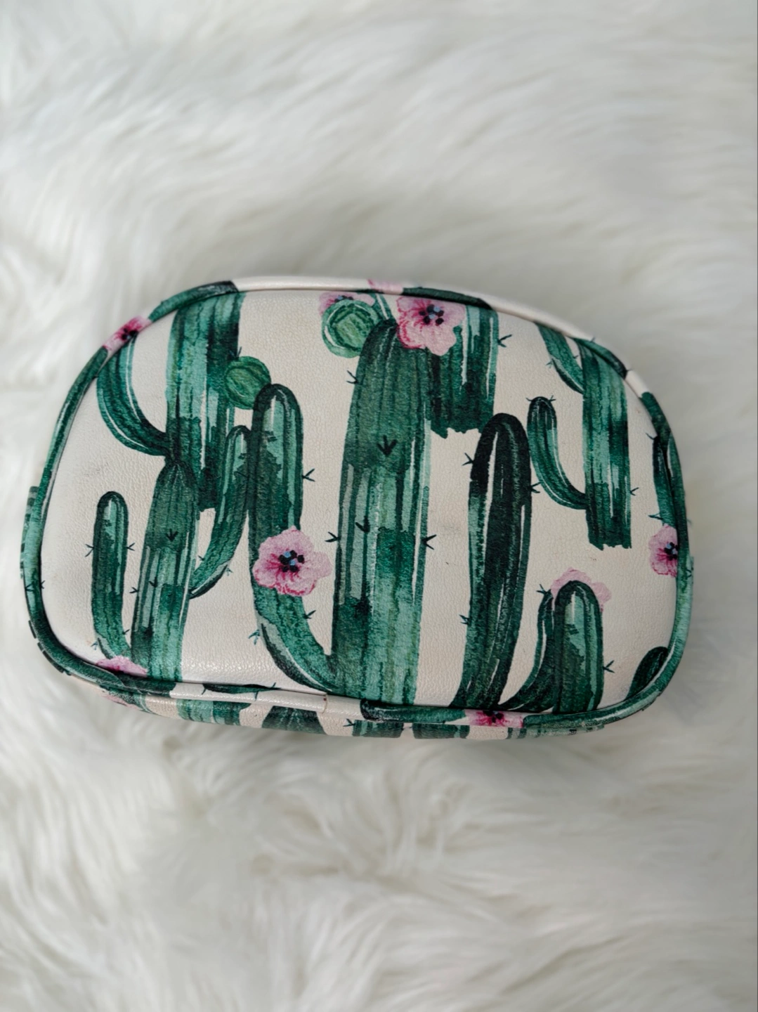 A small, oval makeup bag with a cactus print. It has a zipper closure. Pet & Smoke Free