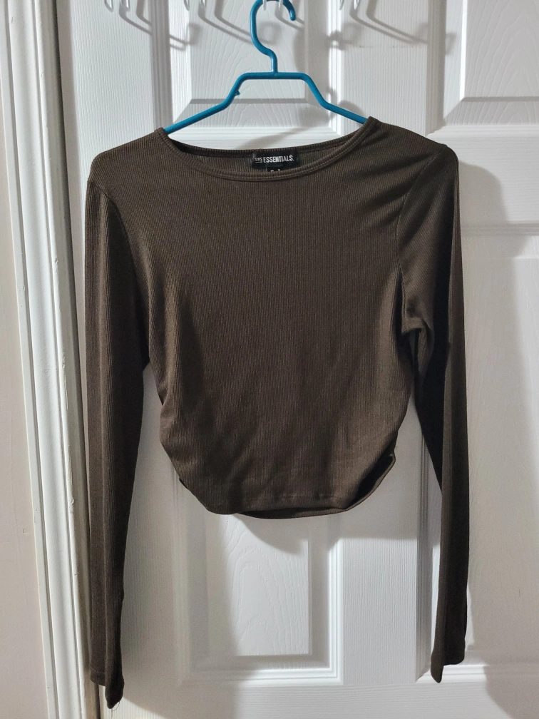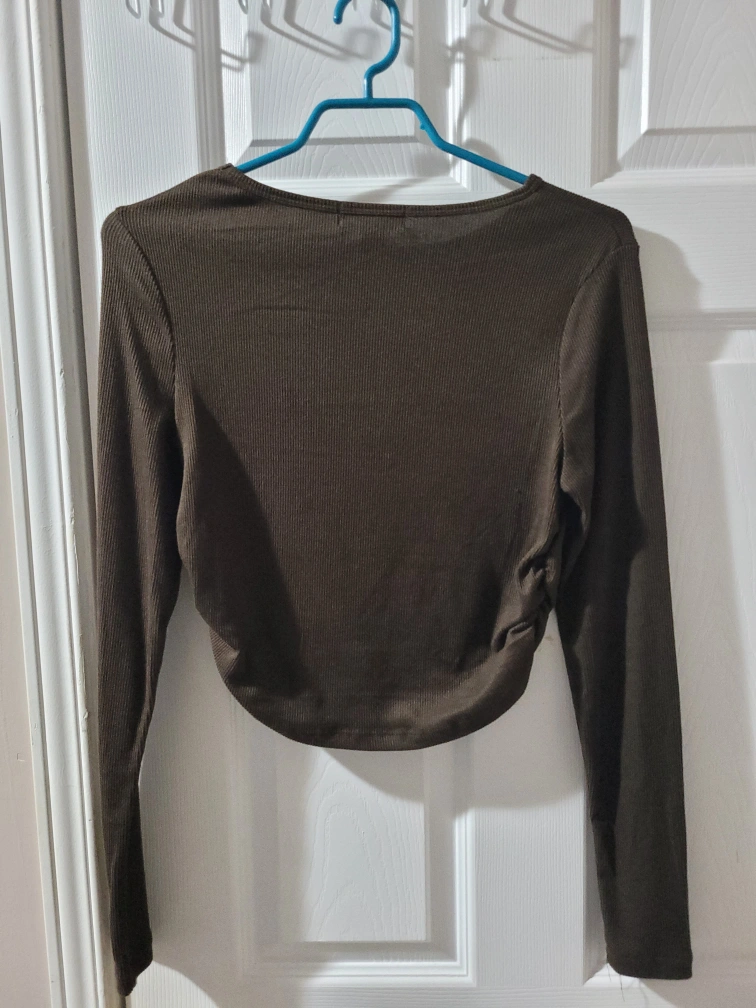 Long sleeve, ribbed, brown crop top. The top is in good condition. It has a round neckline and a slightly fitted silhouette. The fabric is soft and stretchy. The top is perfect for layering or wearing on its own. It is a great casual or dressy option. The top is a size medium. Please see photos for details.
