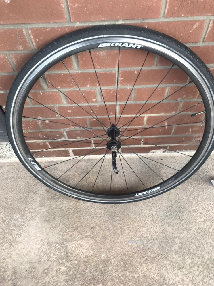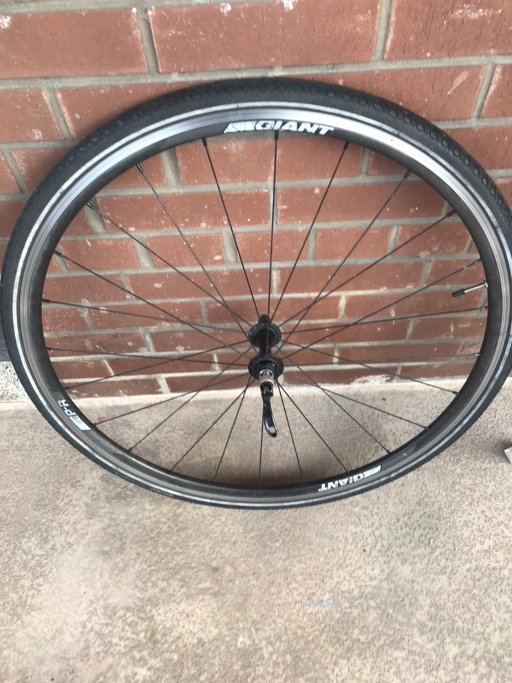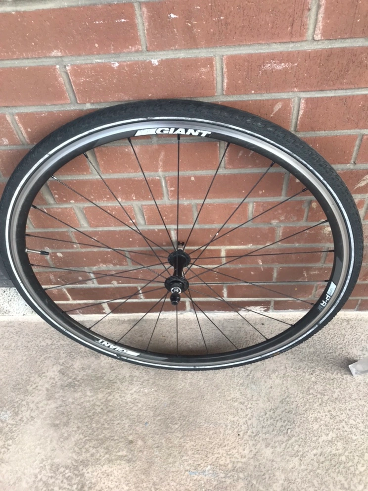 636This wheel is in good used condition with some wear and tear. It is a Giant wheel, and has a quick-release hub. It comes with a tire.