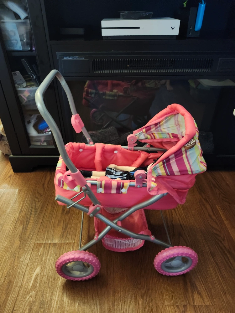 Doll stroller with pink frame, striped fabric and a basket underneath. It folds up for storage. has a removable piece that becomes a baby carrier. pick up only