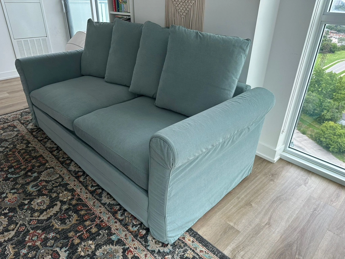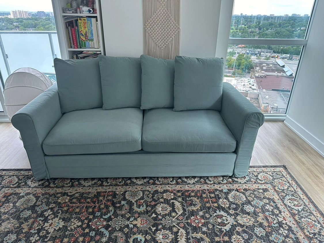 56Teal green sofa bed with four back cousions. Great condition, easy to transform into bed. Self pick up. Price negotiable. Available Oct 21