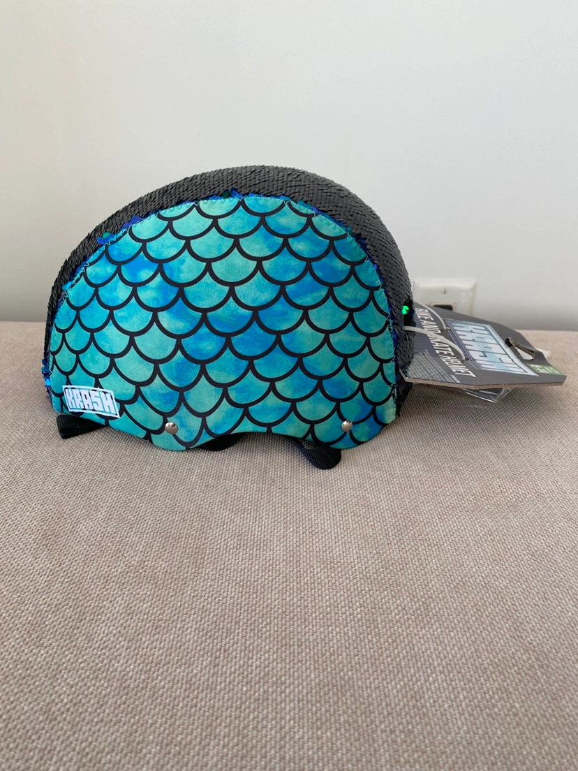 Brand new bike and skate helmet. It's mermaid themed and the scales can be switched from black to the shiny blue & green (see pictures). The shiny side can be blue or green depending on lighting and your viewing angle. Struggling to let this one go since I still think it's pretty cool, but I keep using the same helmet I already have and I dont wanna be a hoarder lol.