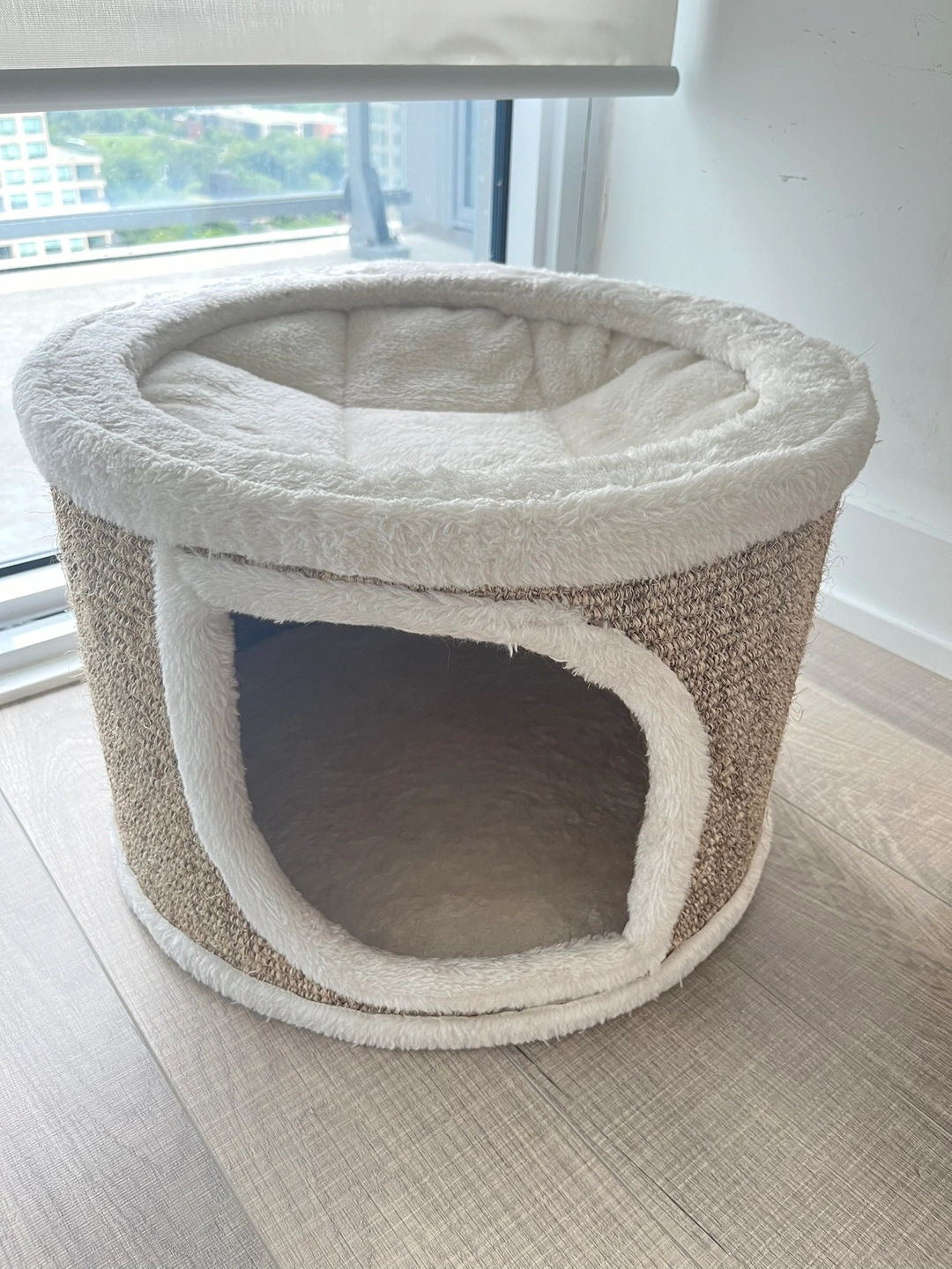 This is a round, beige cat bed with a white fur lining and a hole leading into a hidden area. It is great for cats who like to hide and sleep. Condition is very good almost as new.