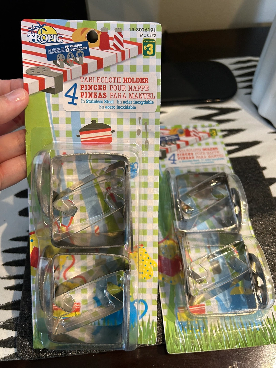 Four stainless steel tablecloth holders in packaging. They aren’t suitable for the picnic table we bought them for.