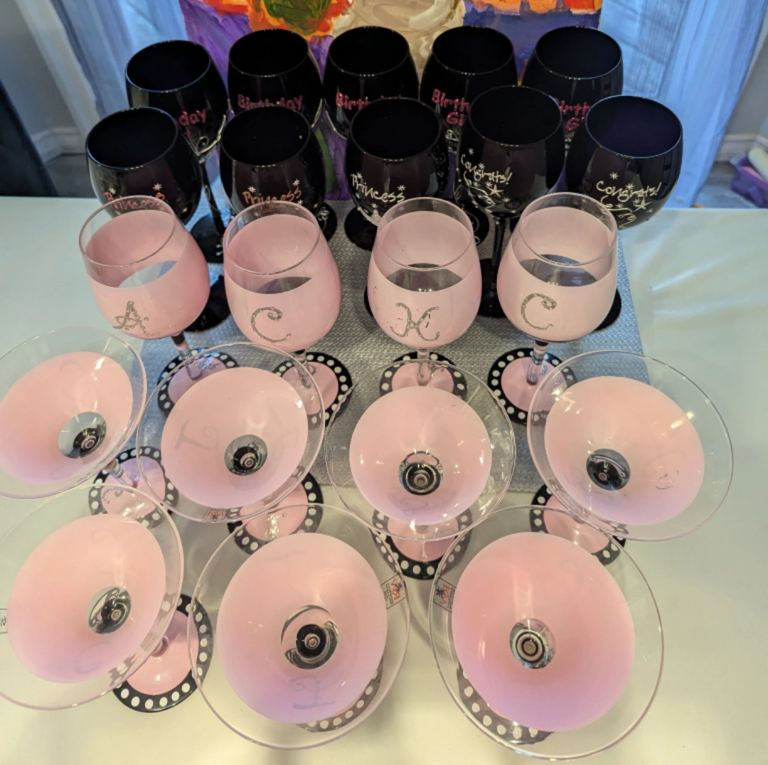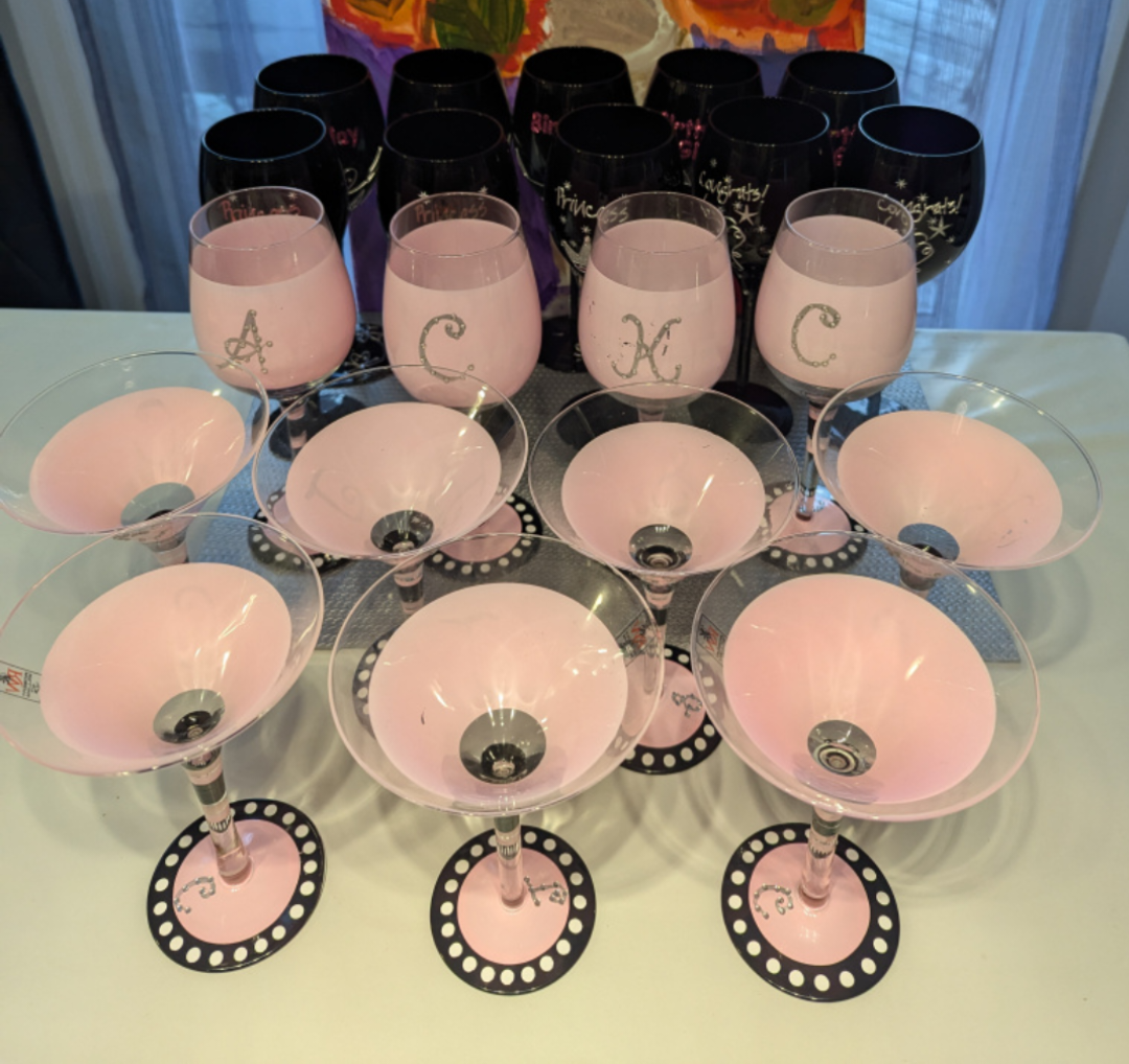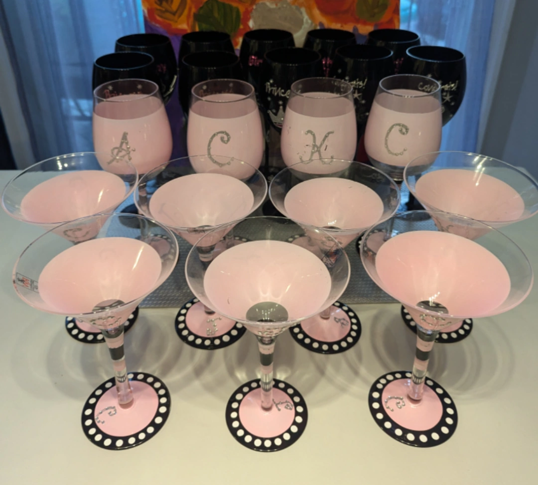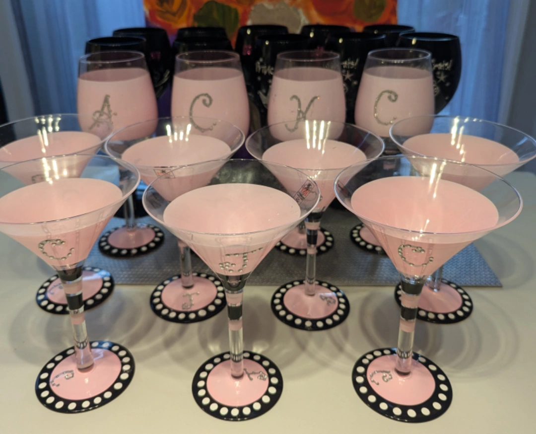 Wine & Martini glasses Celebrate in style with this Wine GlasesThe wine glasses features a fun and perfect for any birthday celebration. 21 pic 14 pic for Wine 7 pic for Martini Some new& some used 1 time Set of 8 martini glasses with a pink base and black and white accents.