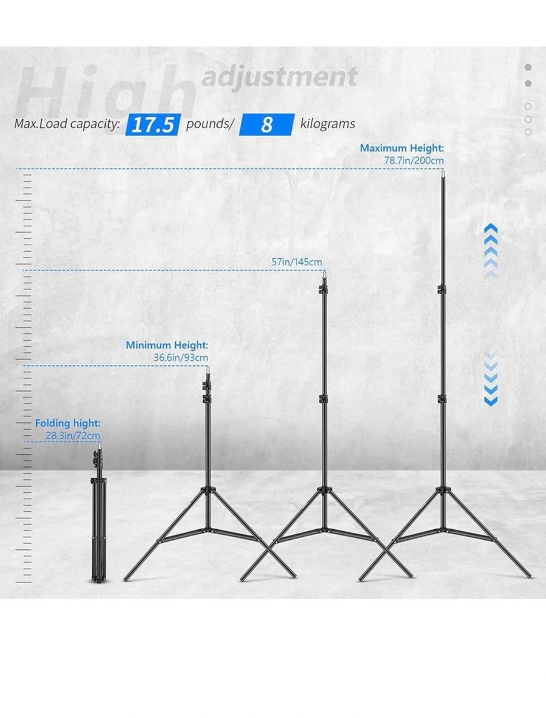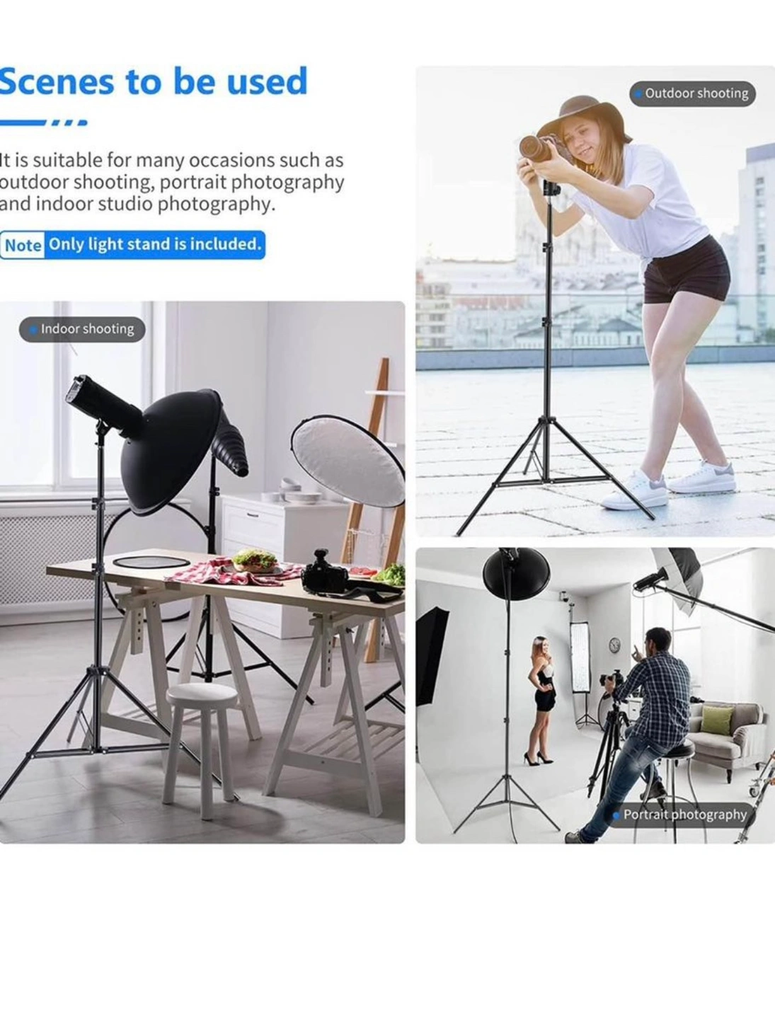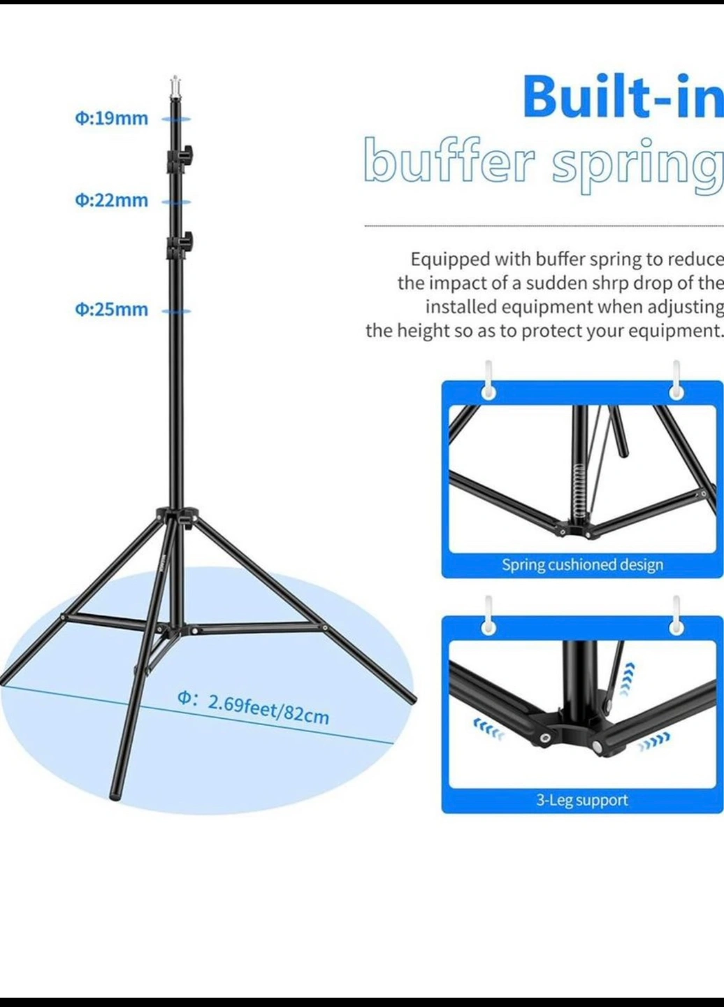 A light stand tripod designed for indoor or outdoor use. It features a built-in buffer spring to reduce the impact of a sudden drop of the installed equipment when adjusting the height. Never used.