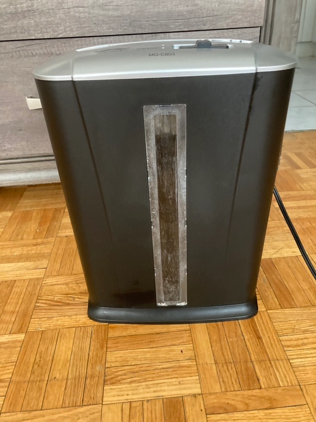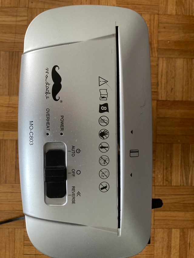 Moustache paper shredder. It is a cross-cut shredder with a safety feature. It also has a reverse button. Only used a couple of times, excellent condition like new!