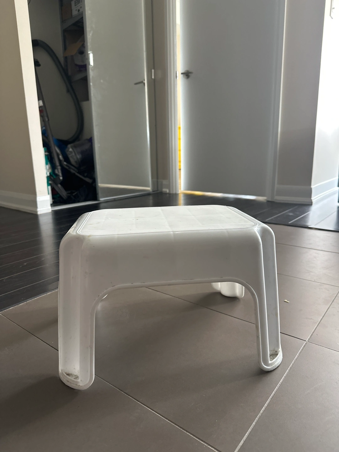 Rubbermaid white plastic step stool. Perfect for reaching high shelves or for kids. This stool is lightweight and easy to move.