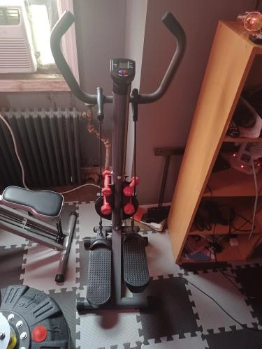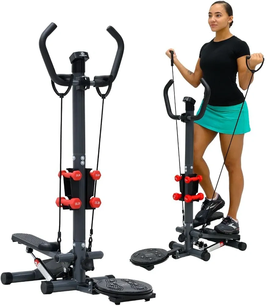 This is a stepper with a twist table and dumbbells. It comes with resistance bands that can be attached to the top to help you get a full-body workout