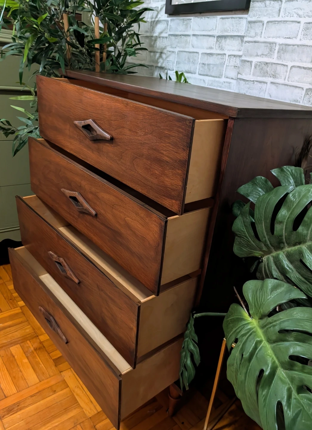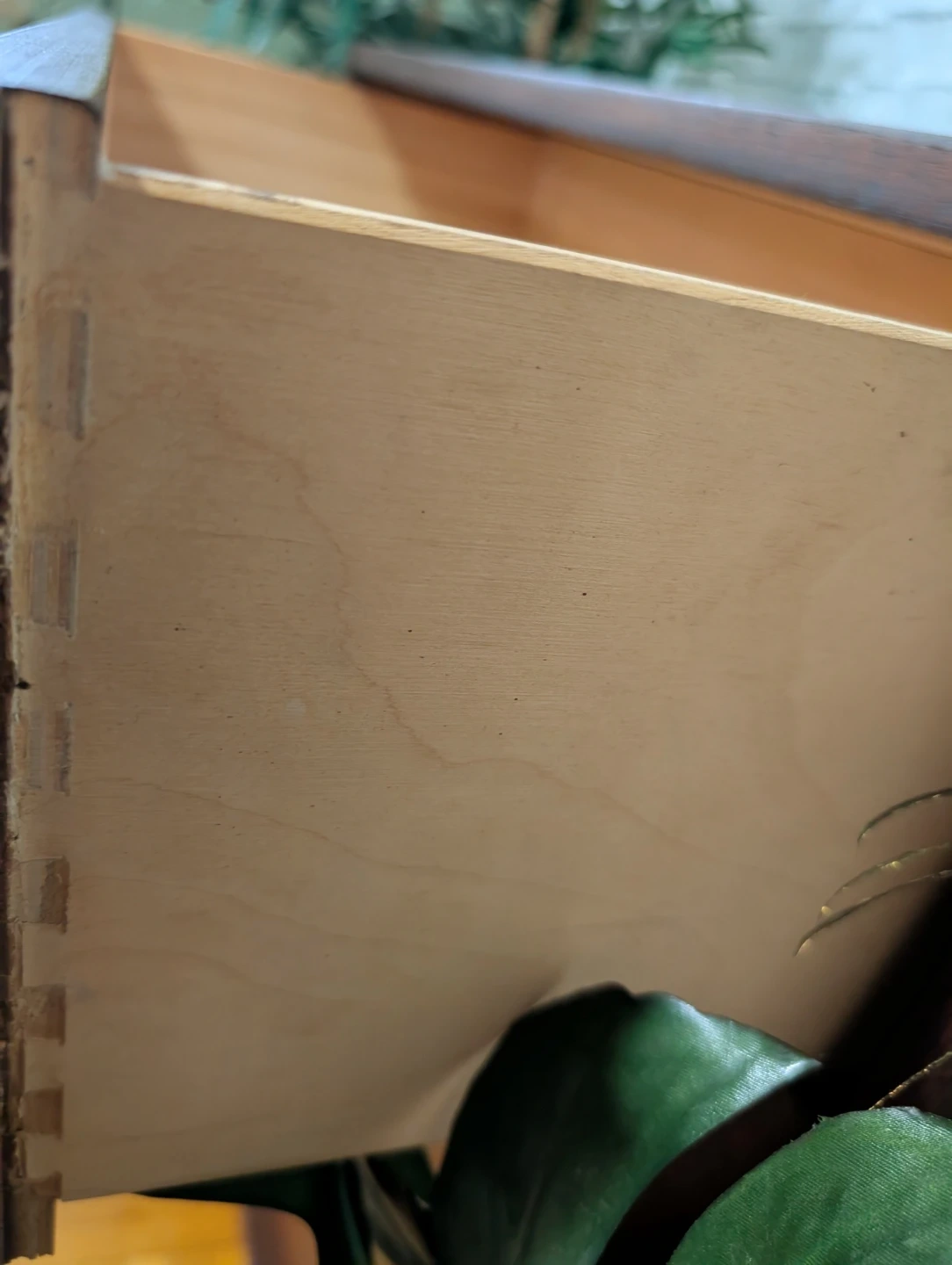 Carved drawer pulls with drawers which slide smoothly with dovetail sides.