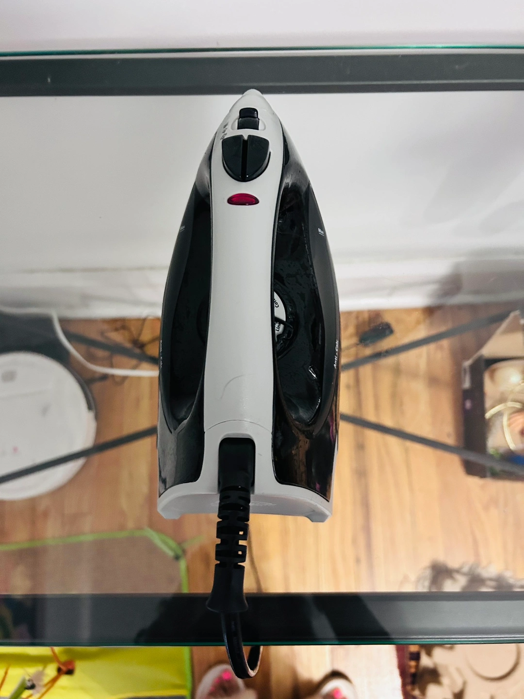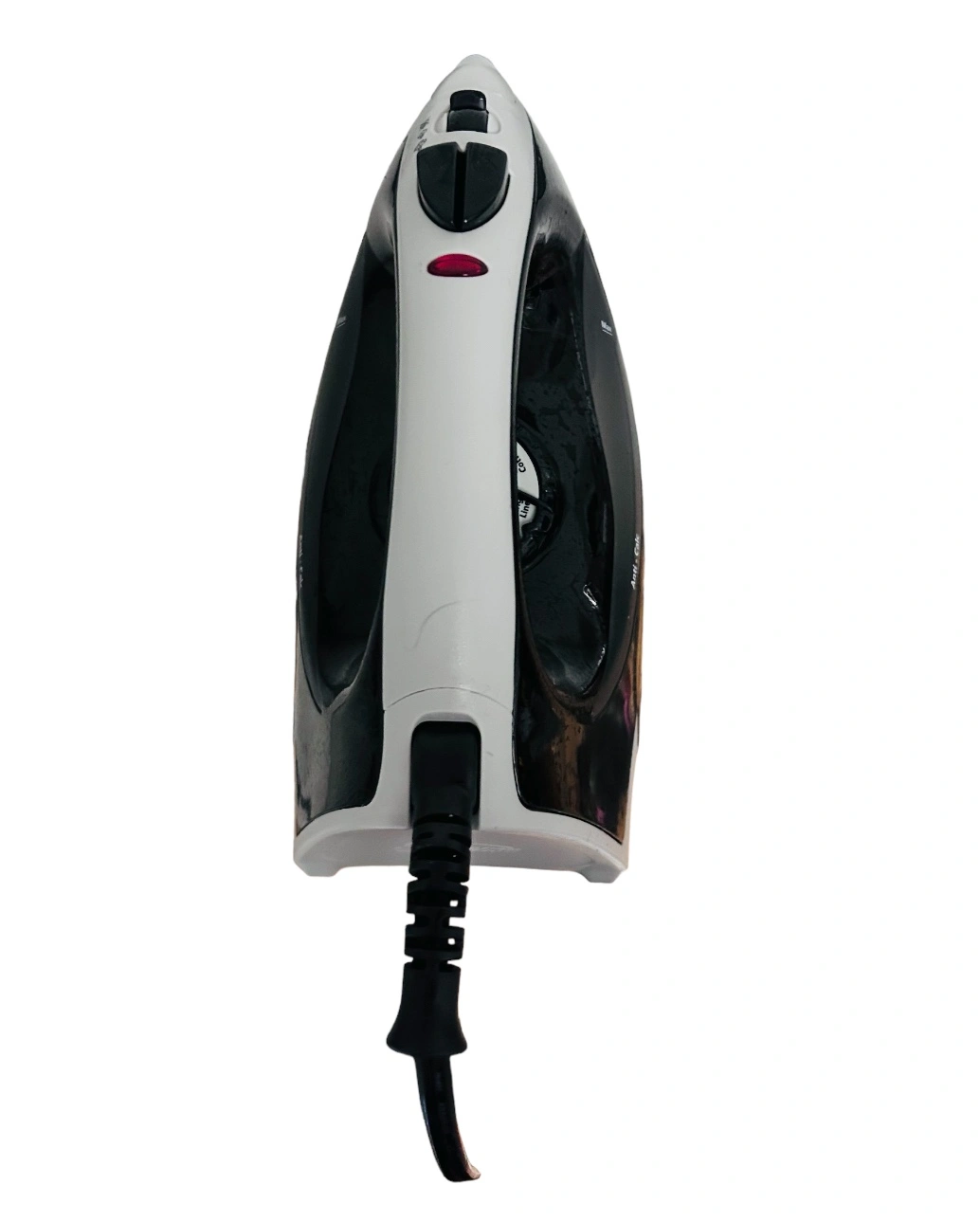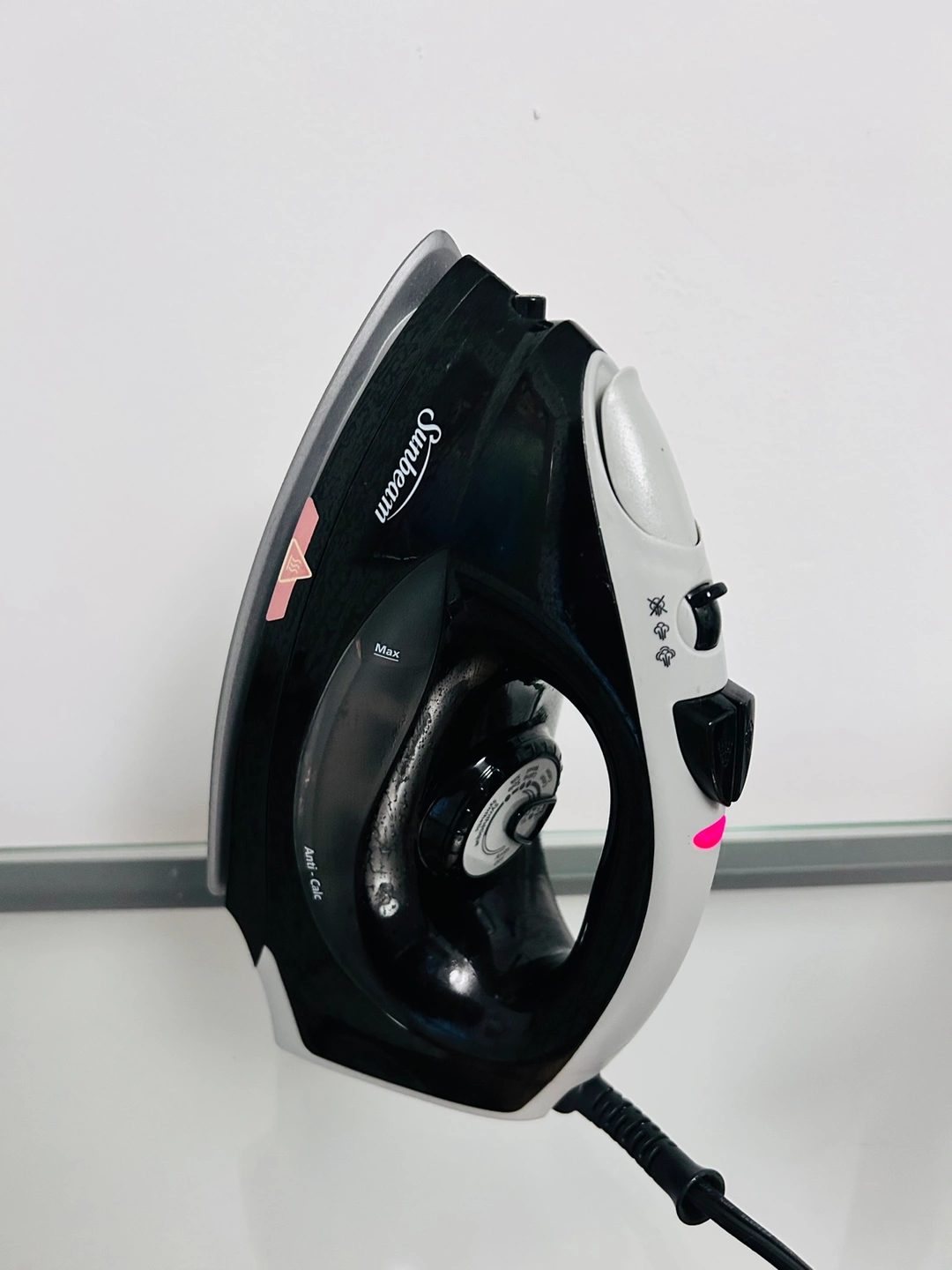 A Sunbeam iron in black and white. It has a steam function. There is a dial to adjust the temperature. It has an auto shut-off feature. The iron comes with a cord and plug.