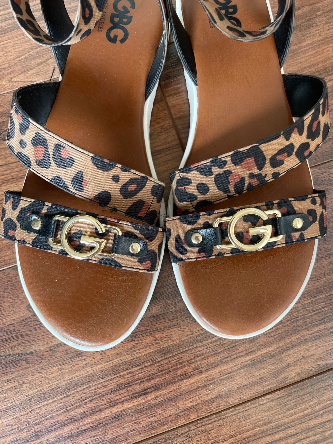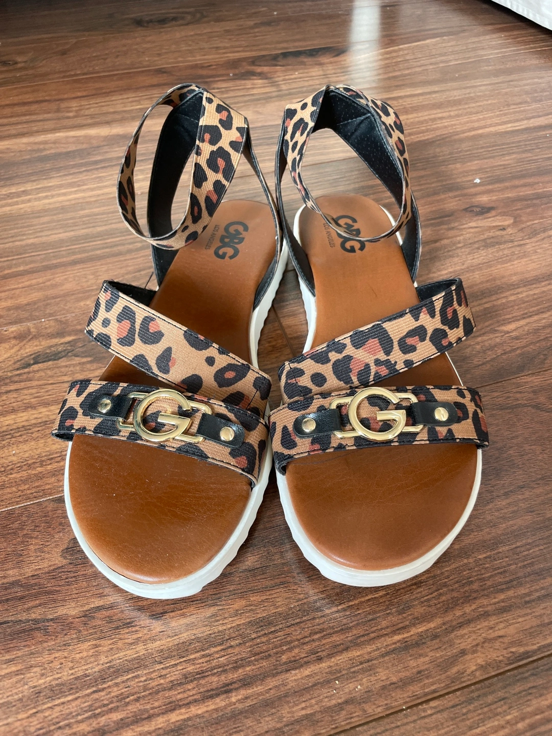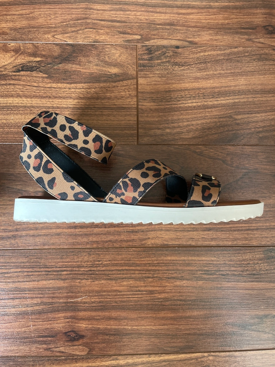 These sandals feature a leopard print design, gold accents, and an ankle strap. They are perfect for summer and will look great with any outfit.