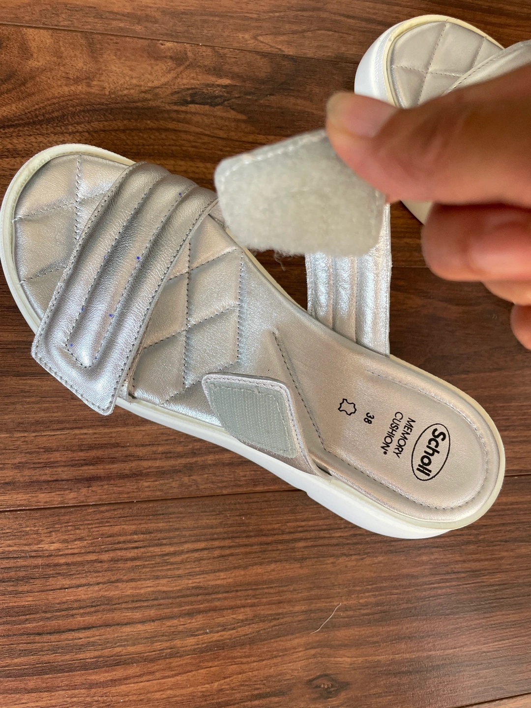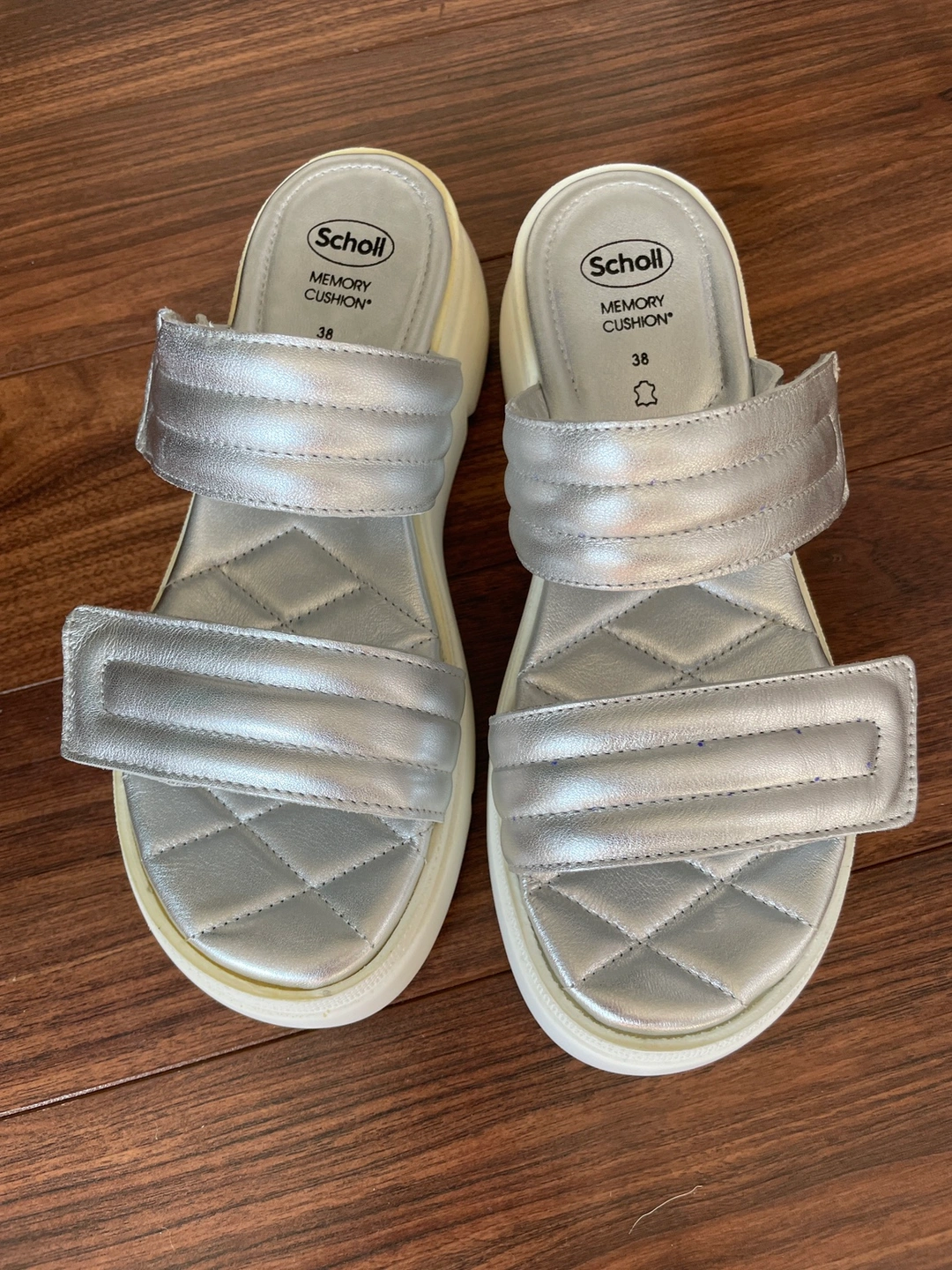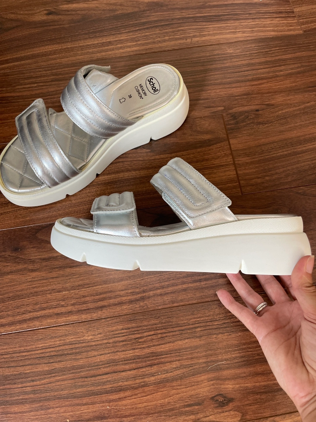 Dr Scholl silver platform slides