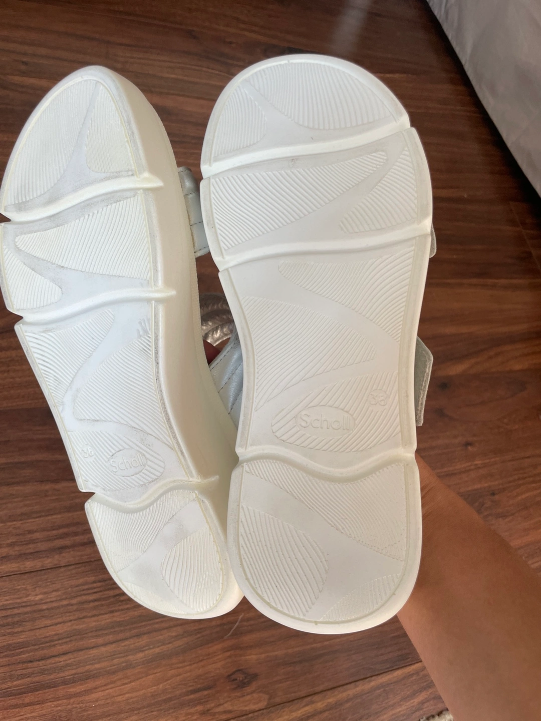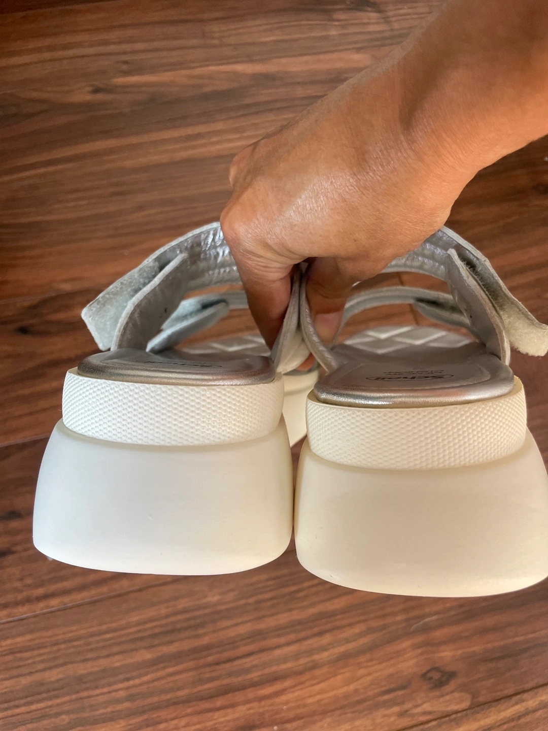 Silver slides sandals with a white platform. Straps are adjustable with Velcro