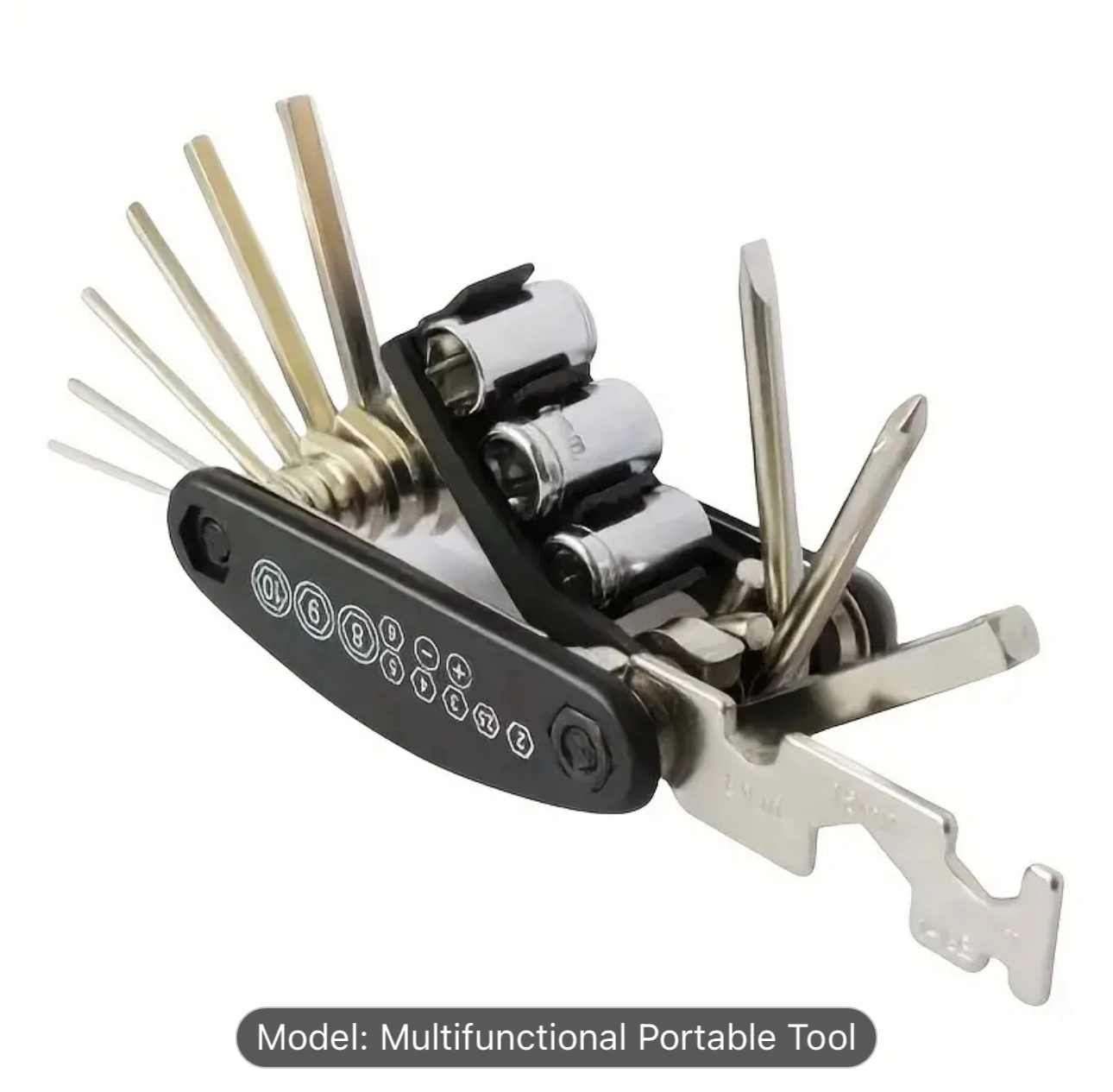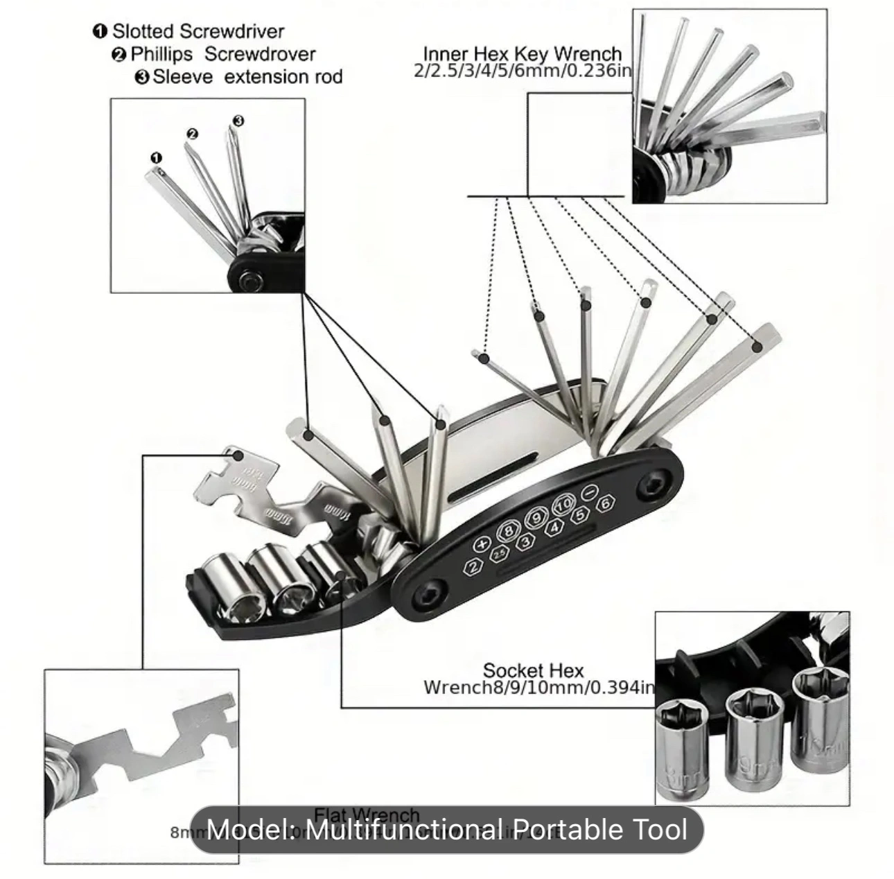 113This is a multi-tool for bicycle repairs. It includes a variety of tools, such as screwdrivers, wrenches, and a chain tool. The tool is compact and easy to carry, making it ideal for cyclists who need to make repairs on the go.