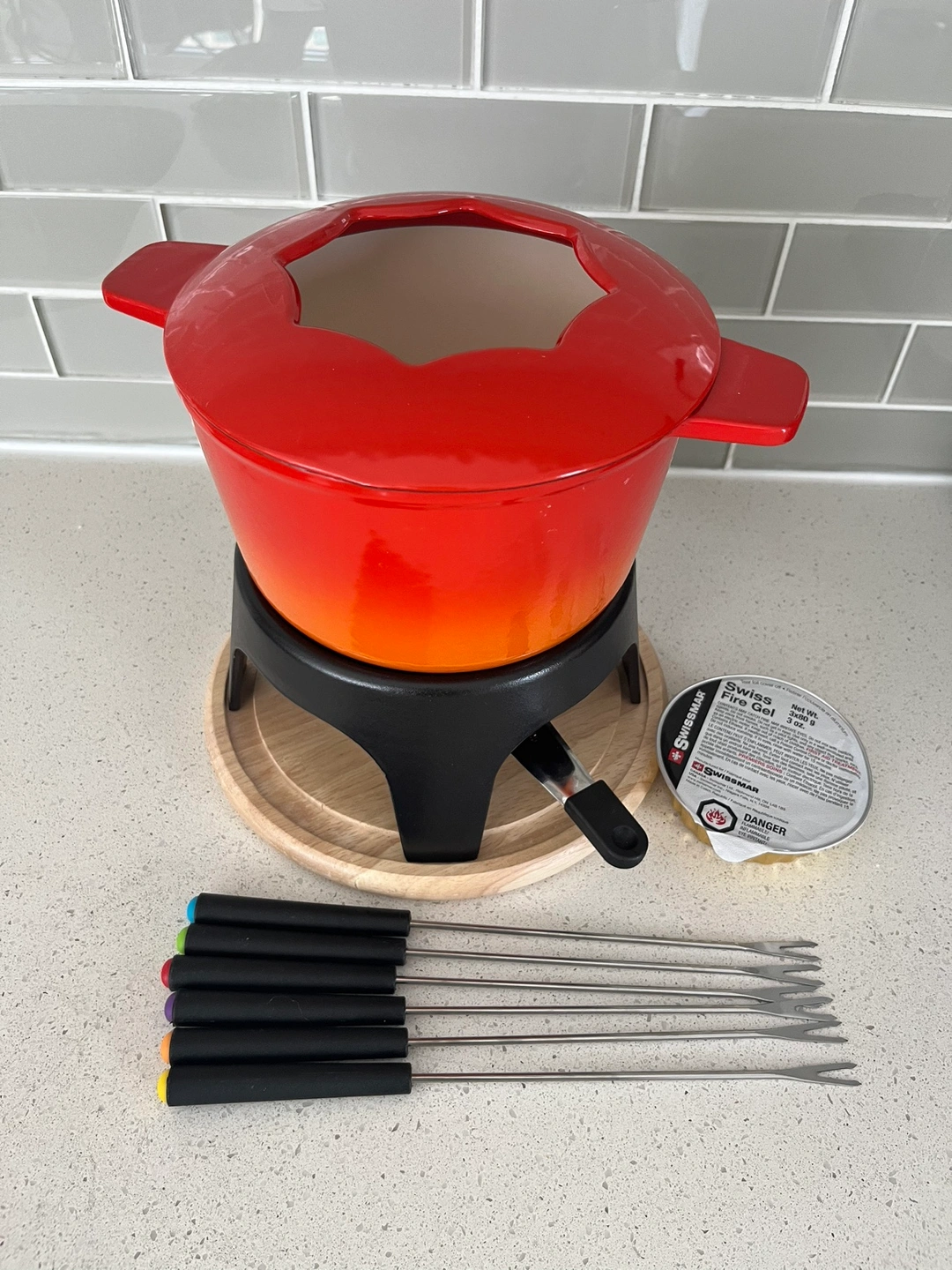 It includes the fondue pot, stand, fire gel, and six fondue forks. It is in good condition and has been used a few times.