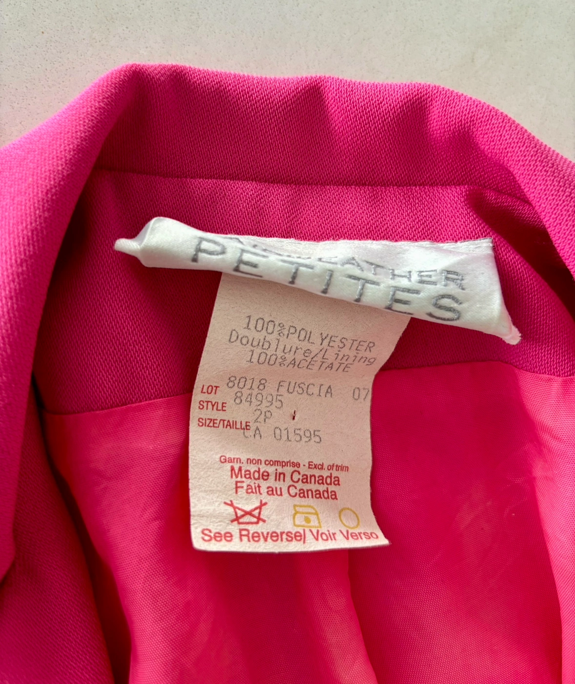 This is a women's suit jacket and skirt set in a vibrant pink colour. The jacket is short-sleeved with a button-up front and the skirt is a pencil skirt. Made in Canada.