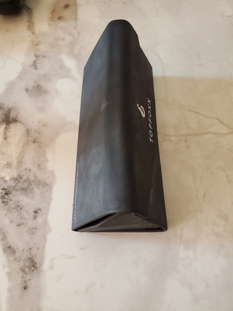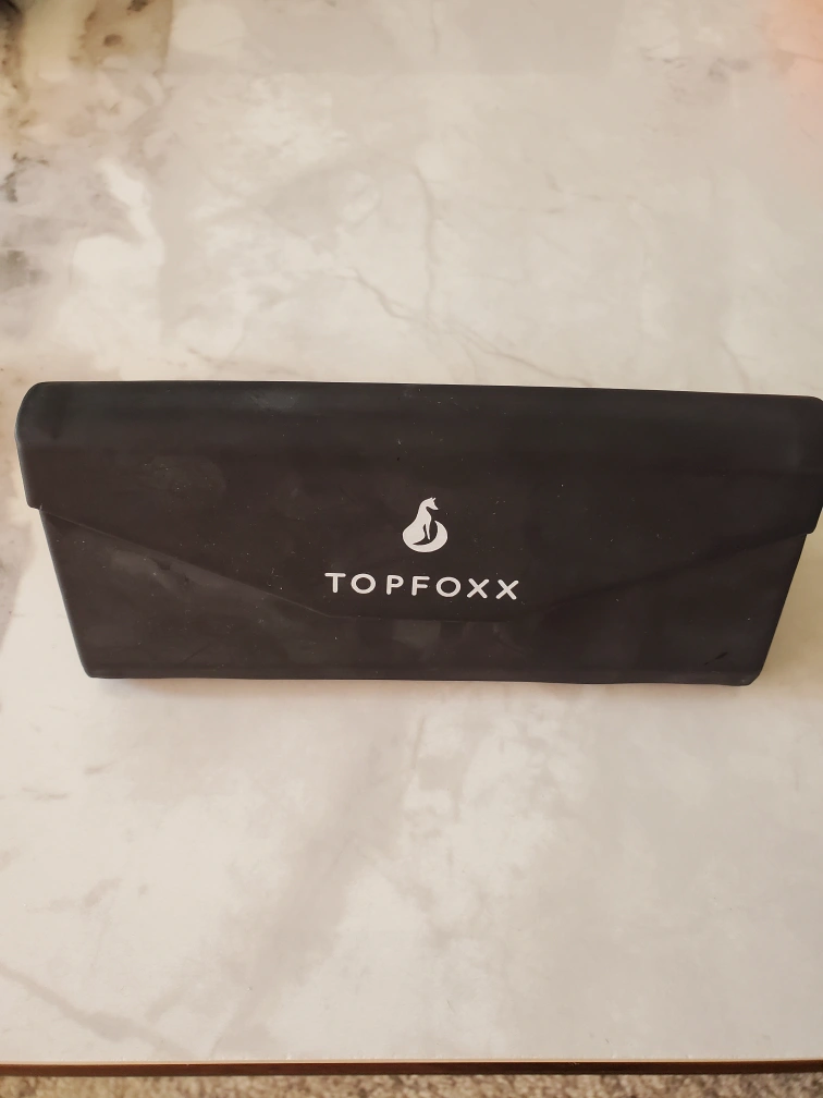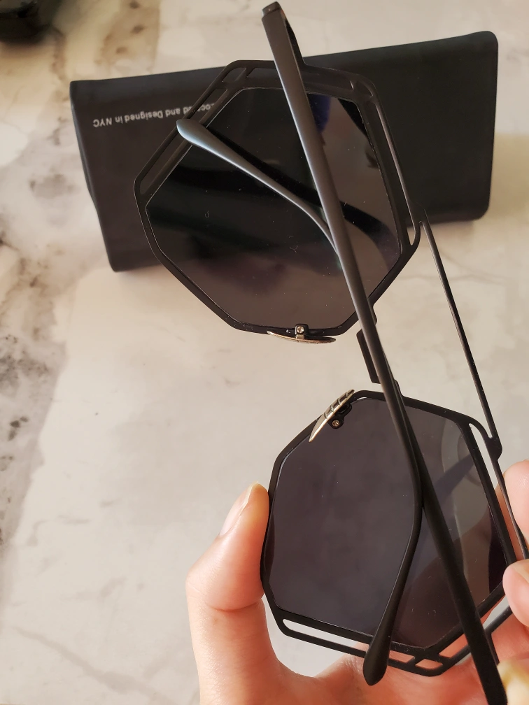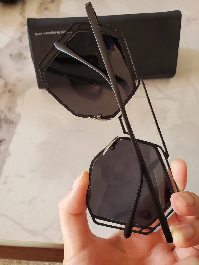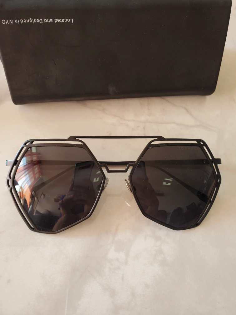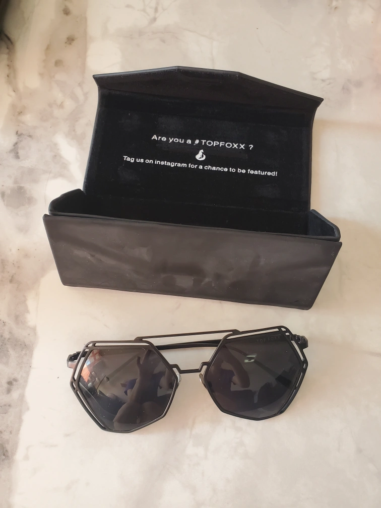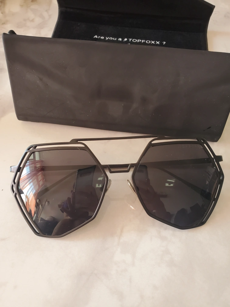 Black sunglasses from TopFoxx with a unique geometric aviator style frame shape and dark lenses, case included