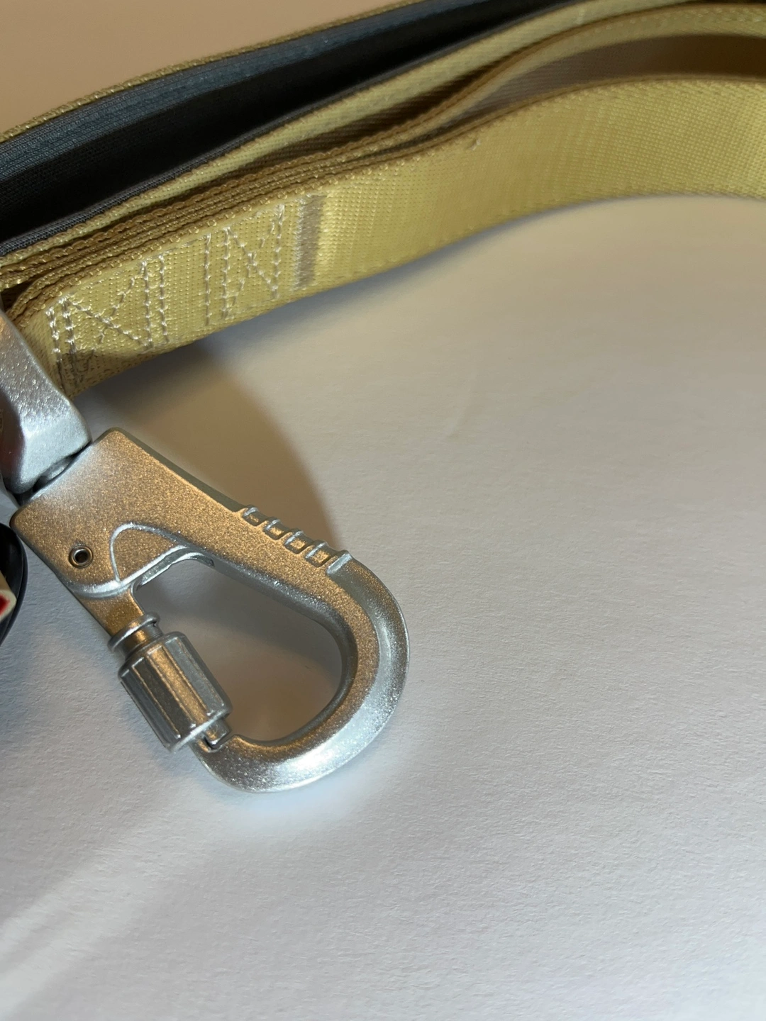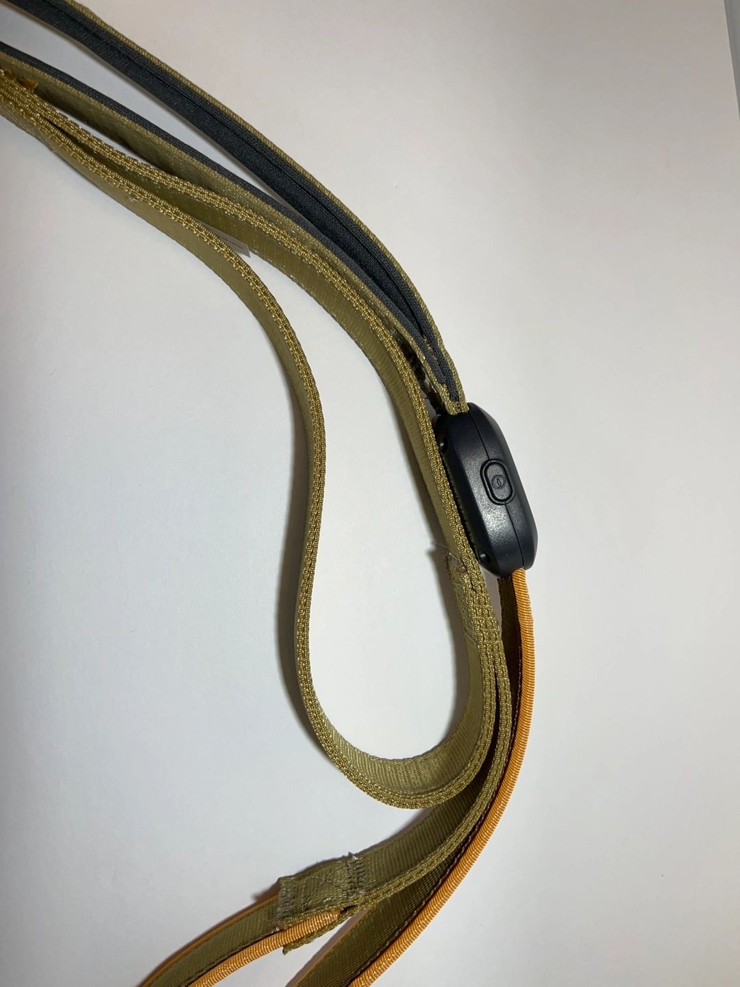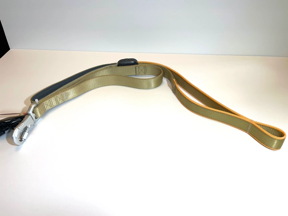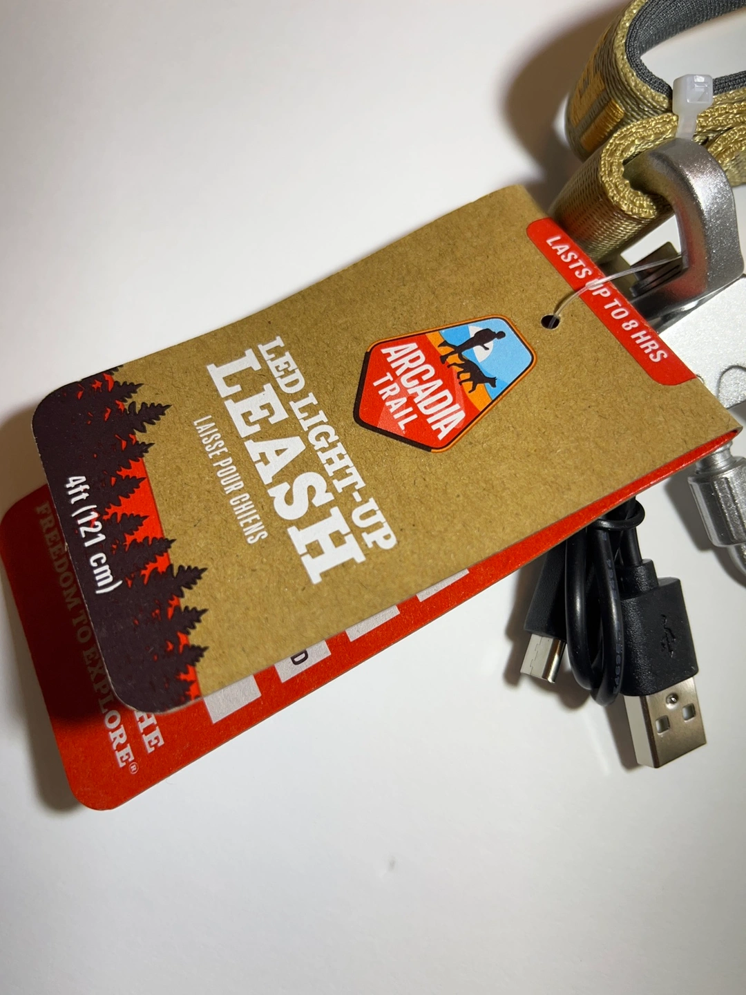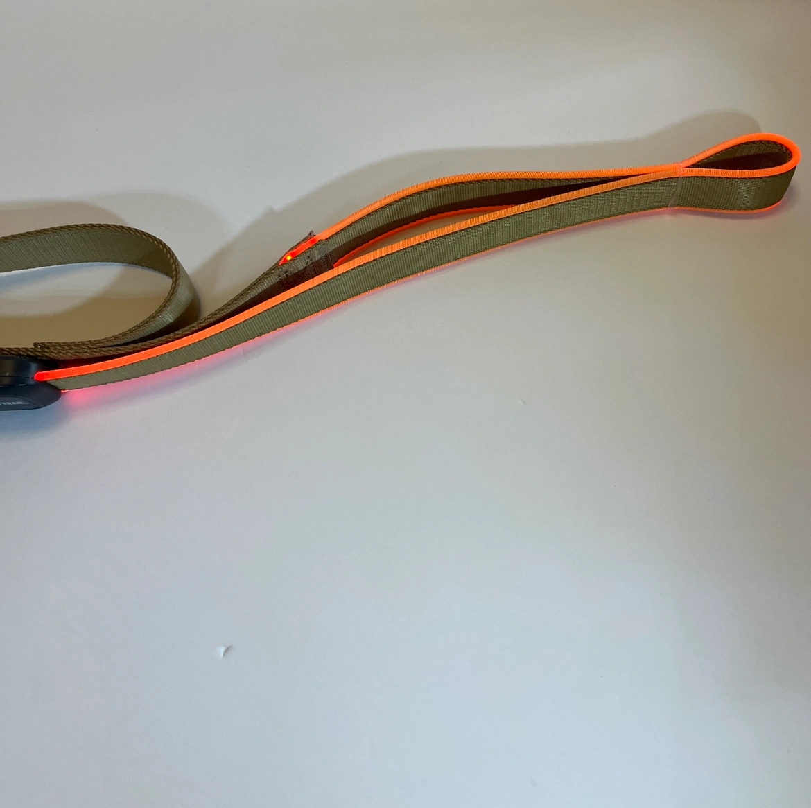This is a dog leash with a built in LED light (with different settings to choose from) on the handle. It is tan in colour with orange trim. The leash is approximately 4 feet long.