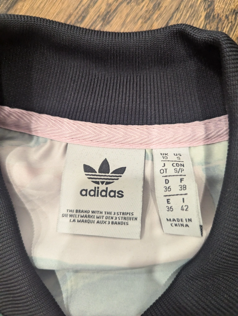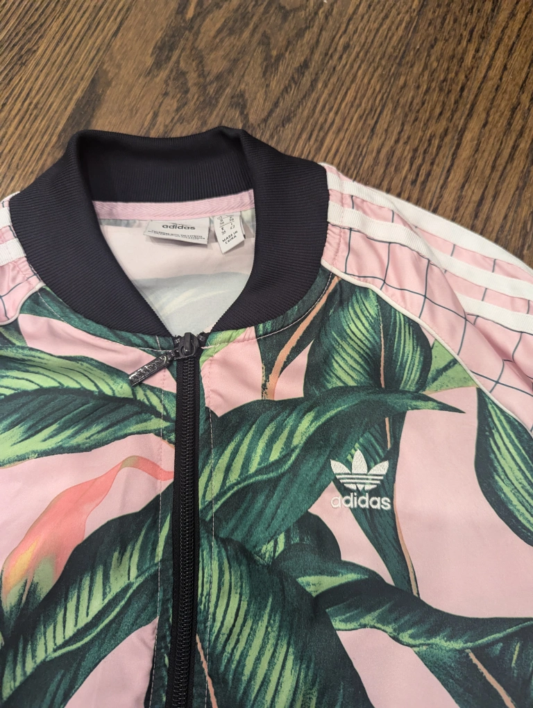 251Brand: Adidas Originals Condition: LIKE NEW Size: Small (could fit extra small - medium depending on your desired fit) Pickup: St. Clair and Spadina or St Clair West station Farm Rio Adidas Womens Pink and Green Tropical Palm 3-Stripe Zip Up. The FARM Company draws inspiration from the revolutionary Brazilian street dance passinho. This track jacket is made of shiny satin with clashing geometric and tropical leaf prints. The FARM Company adidas Originals teams with Brazilian trendsetters The FARM Company for a vibrant collaboration of Iconic logo graphics 3-Stripes down the sleeves and a Trefoil logo detail call out adidas heritage.” Features include: - Ribbed baseball collar - Long sleeves with ribbed cuffs - 100% polyester satin - Smooth, drapey fabric - Full zip; Front zip pockets; Ribbed hem - Graphic pattern is randomly placed so each piece is unique Bundle with my other items for discounts! Fastest pickup preferred. Closest intersection is St Clair Ave West and Spadina, can also meet at St Clair W station. Cash (bills) only. Etransfer also accepted.