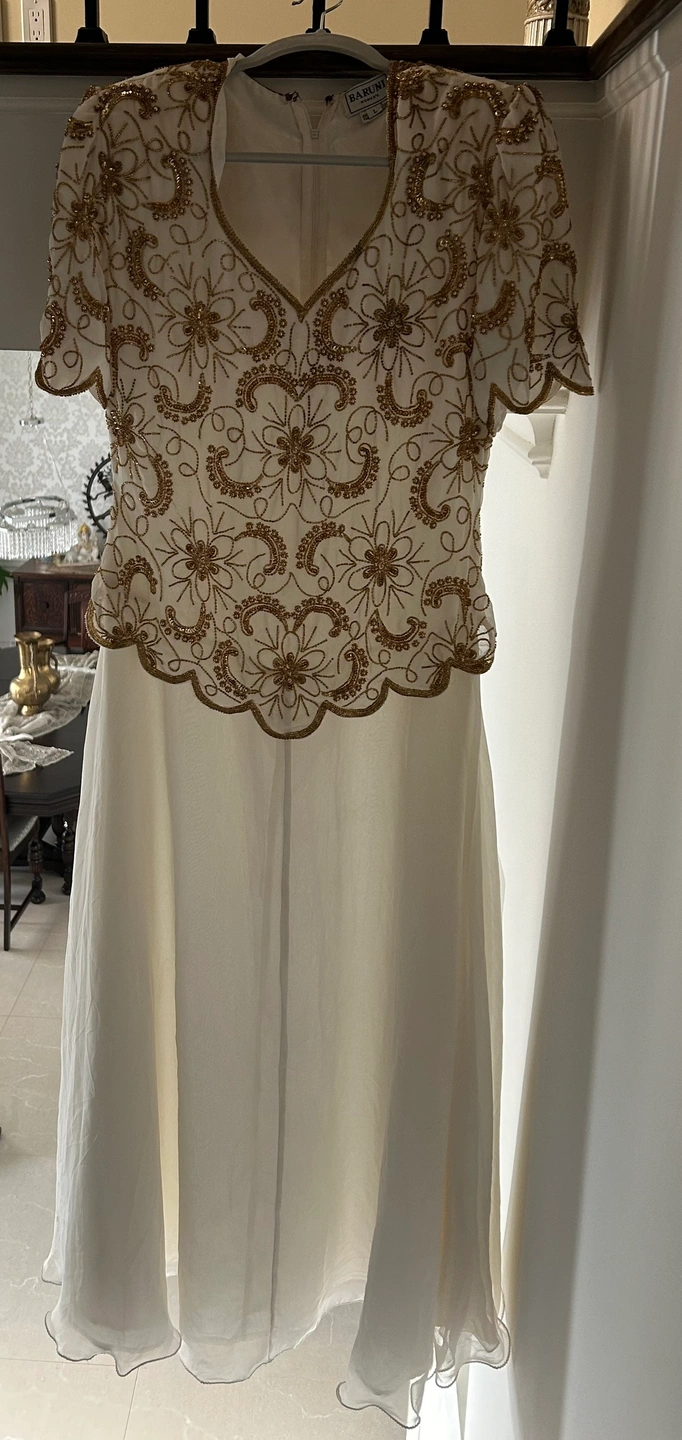 An off white, long one piece dress with a beaded bodice and short sleeves. The dress has a V-neck and is made of a lightweight material. The skirt is flowy and has a scalloped hem. This dress would be perfect for a special occasion.