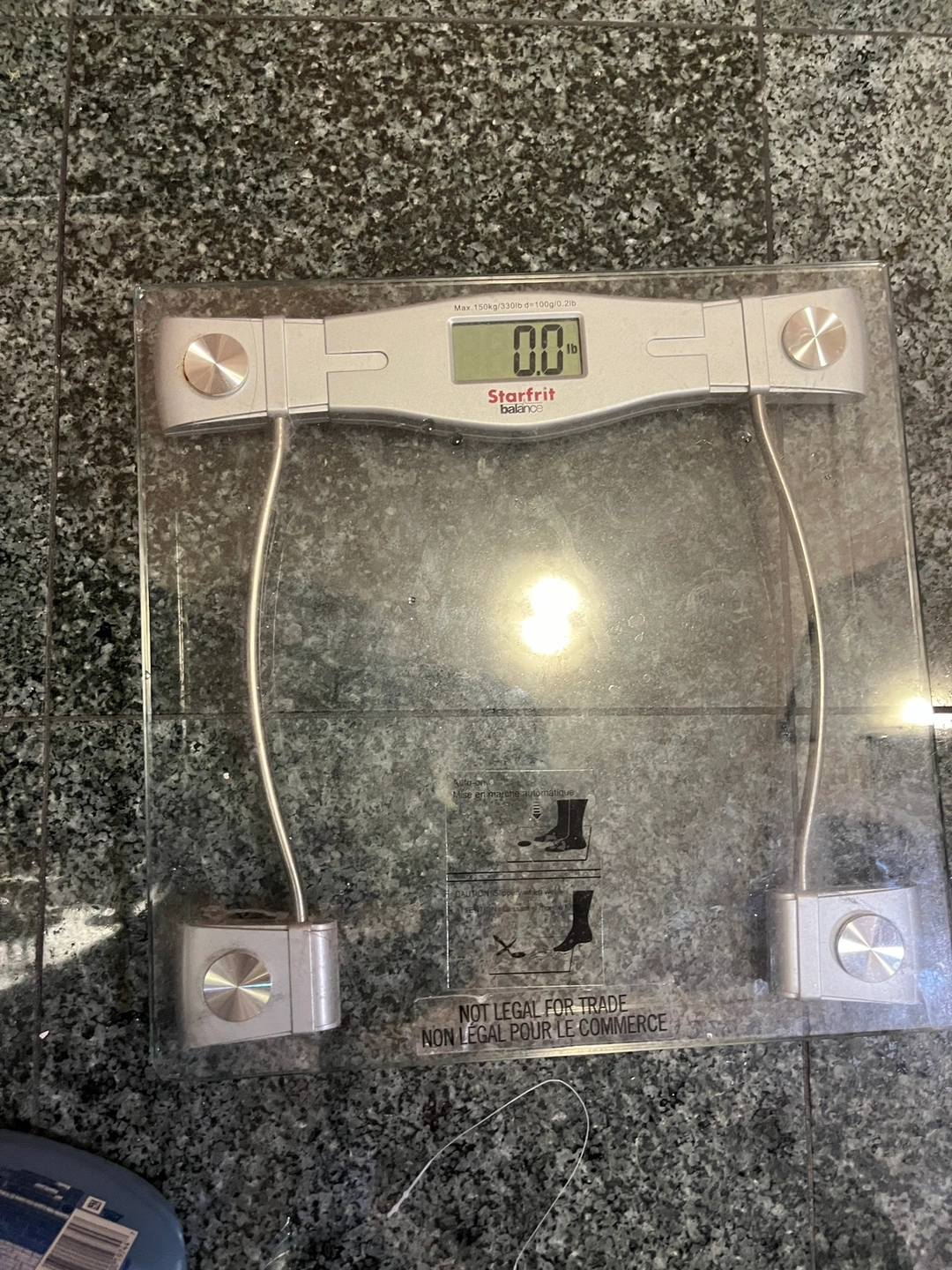 Glass digital scale with a maximum capacity of 330 pounds. The scale has a silver and black design. It has a large display with a 0.2lb resolution.