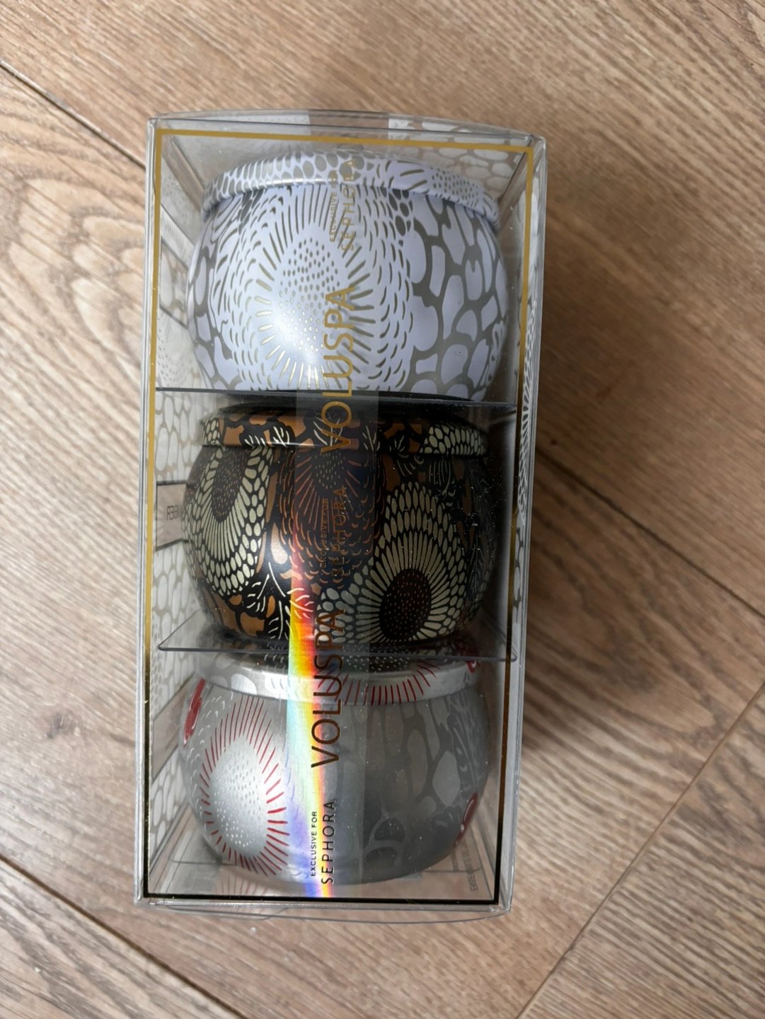 Set of three mini candles from Sephora in the scents Sparkling Cuvée, Balsam & Cedar and Frosted Holly Berry. Brand new in packaging.