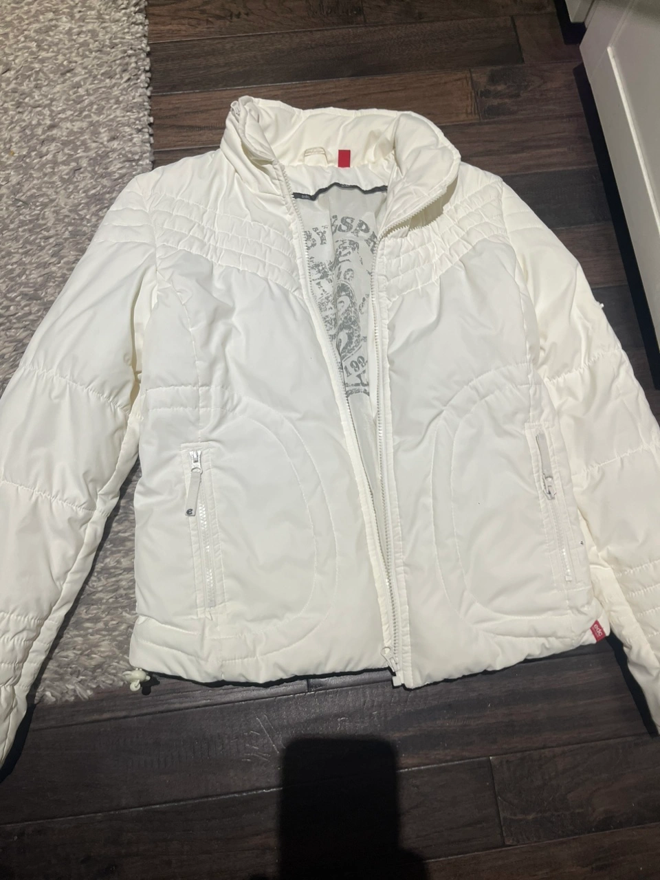 382White puffer jacket with a zip up front and a high collar. The jacket has a logo in the inside middle. The jacket is in size M. It’s in great condition.. make me an offer. Cash only