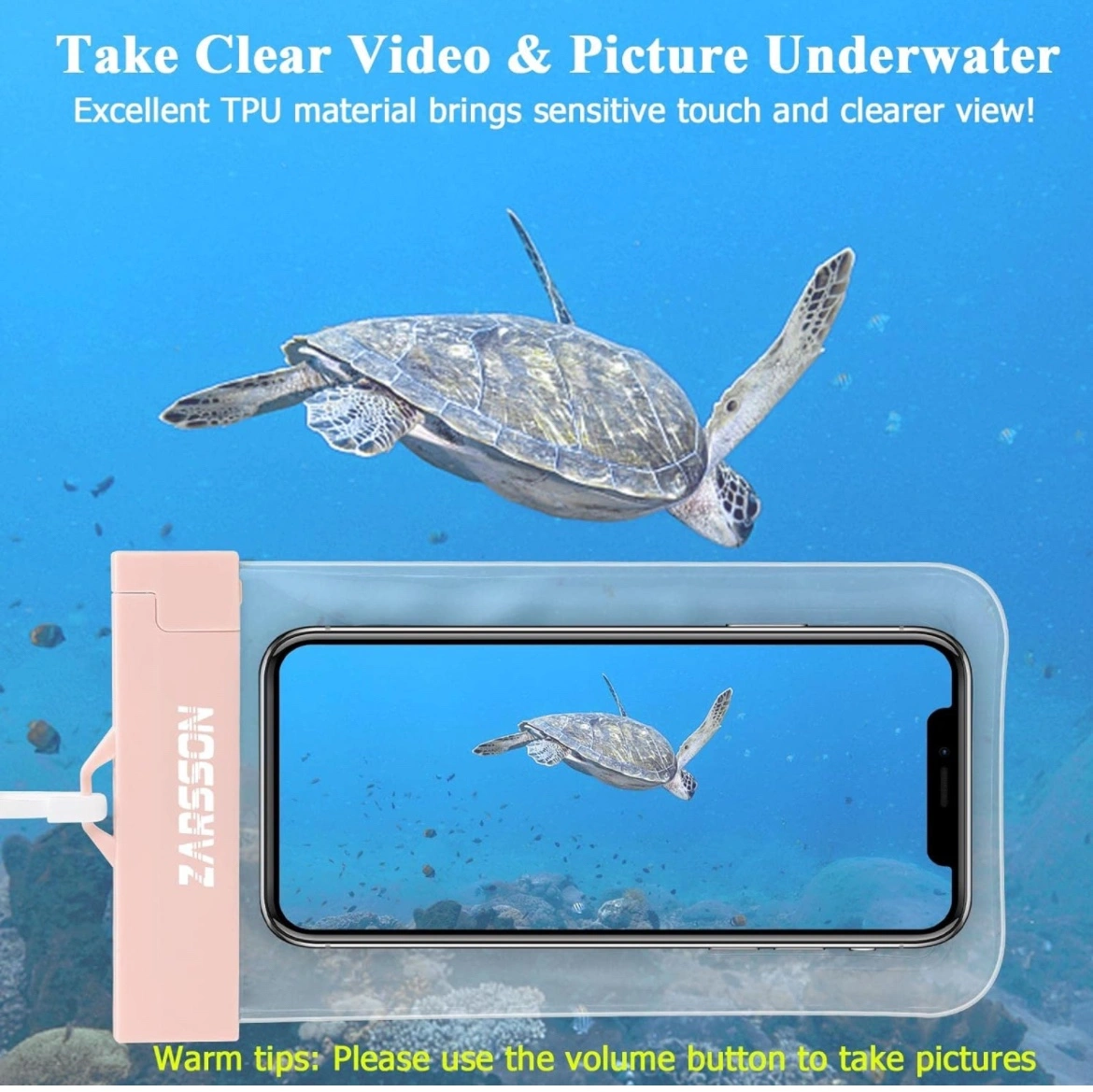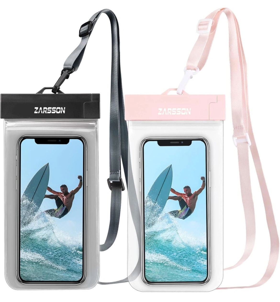Brand new never used! A clear phone case with an adjustable strap. It is designed to keep your phone dry and protected while you are enjoying water activities. It has a secure locking mechanism to keep your phone from getting wet. This case is compatible with phones up to 7.2 inches in size.