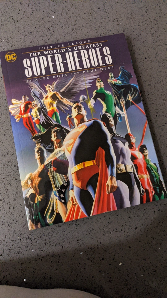 751Justice League the World's Greatest Super-Heroes by Alex Ross and Paul Dini DC Comics TPB Book "DC Comics proudly presents the acclaimed run on Justice League from the Eisner Award-winning team of artist Alex Ross and writer Paul Dini! Between 1998 and 2003, Dini, the Emmy Award-winning producer of Batman Beyond and The New Batman/Superman Adventures, joined forces with the incomparable Ross to create six oversize tabloid editions of stories featuring the World's Greatest Super Heroes. These classic works for all ages feature the iconic DC characters in a unique storytelling format that combines aspects of both comics and picture books. Also included are several pages of promotional art, preliminary art and thumbnails, art done for DC Direct product, model-to-finished-painting comparisons, reflections by the book's creators and much more! This landmark volume also features an introduction by award-winning book designer and author Chip Kidd, and an eight-page foldout featuring an image of every JLA member by Ross. Collects SUPERMAN: PEACE ON EARTH, BATMAN: WAR ON CRIME, SHAZAM!: POWER OF HOPE, WONDER WOMAN: SPIRIT OF TRUTH, JLA: SECRET ORIGINS and JLA: LIBERTY AND JUSTICE"