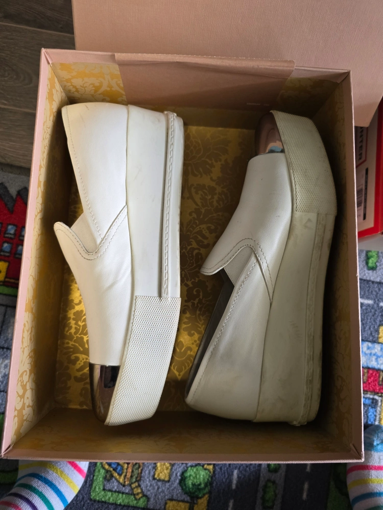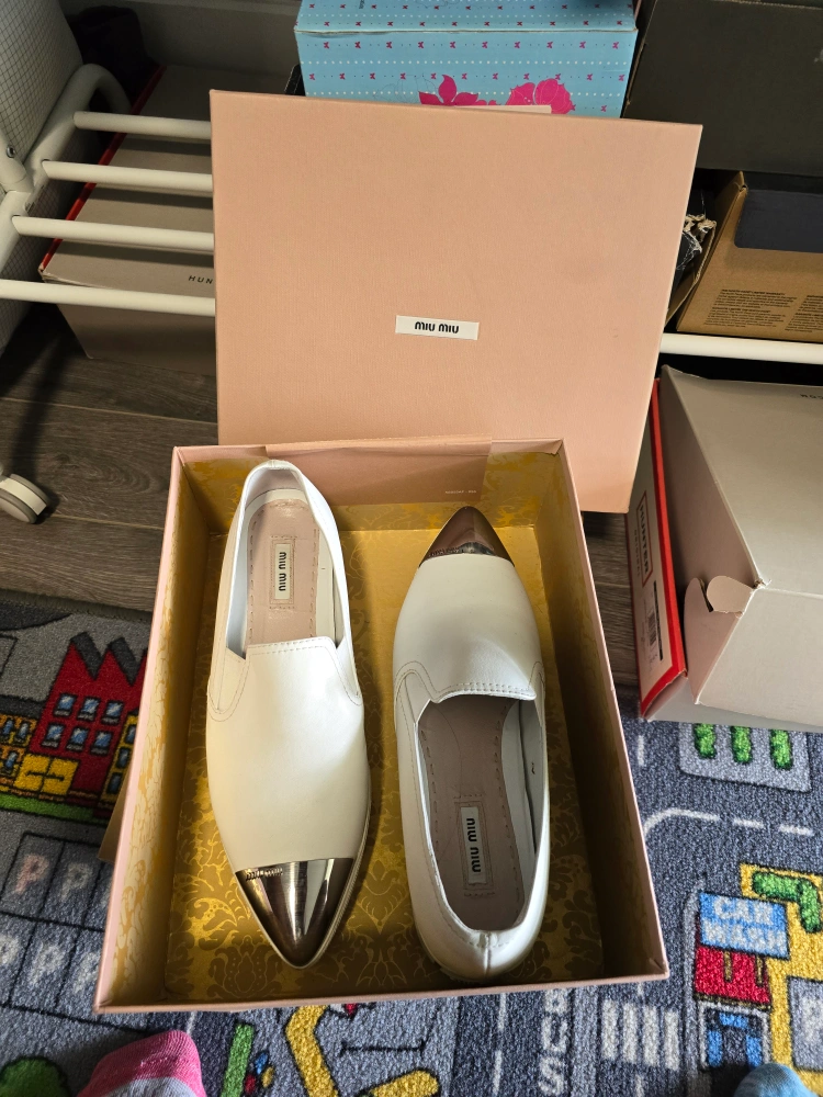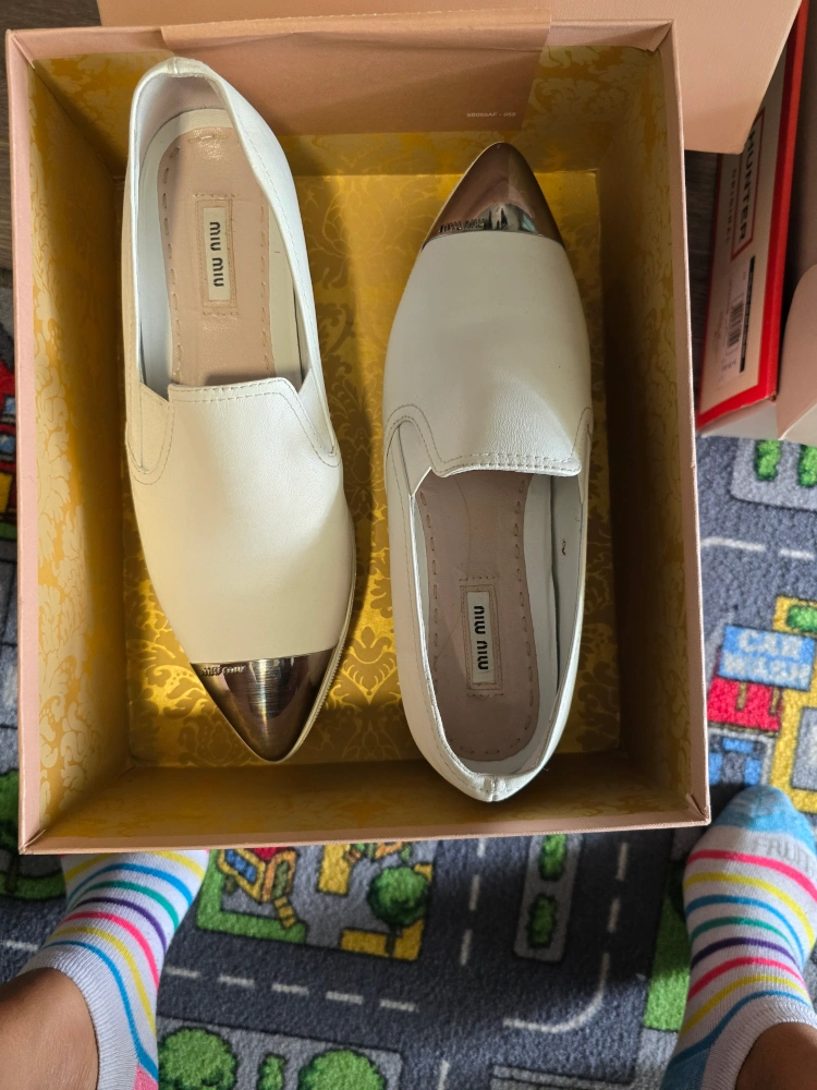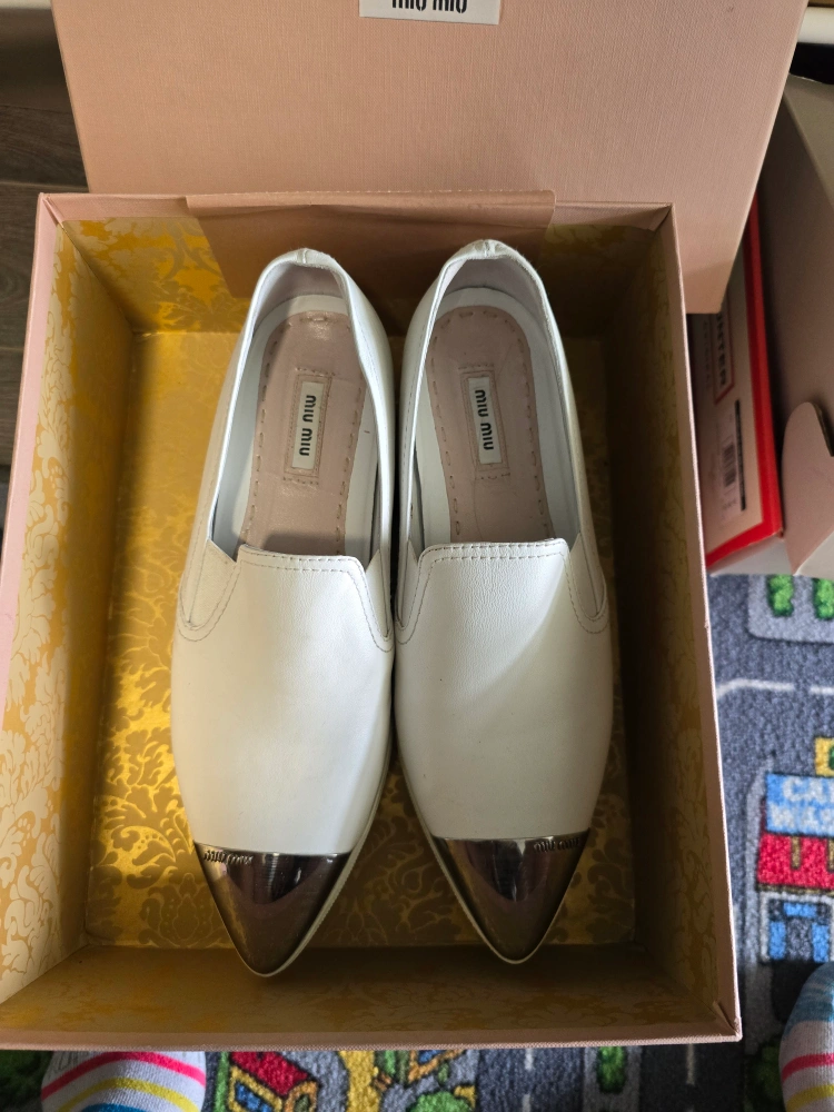860More than good, These are white platform slip-on shoes from MiuMiu. They feature a pointed toe with a silver cap. They come in their original box. needs a clean on the soles and will be brand new. Super comfortable!